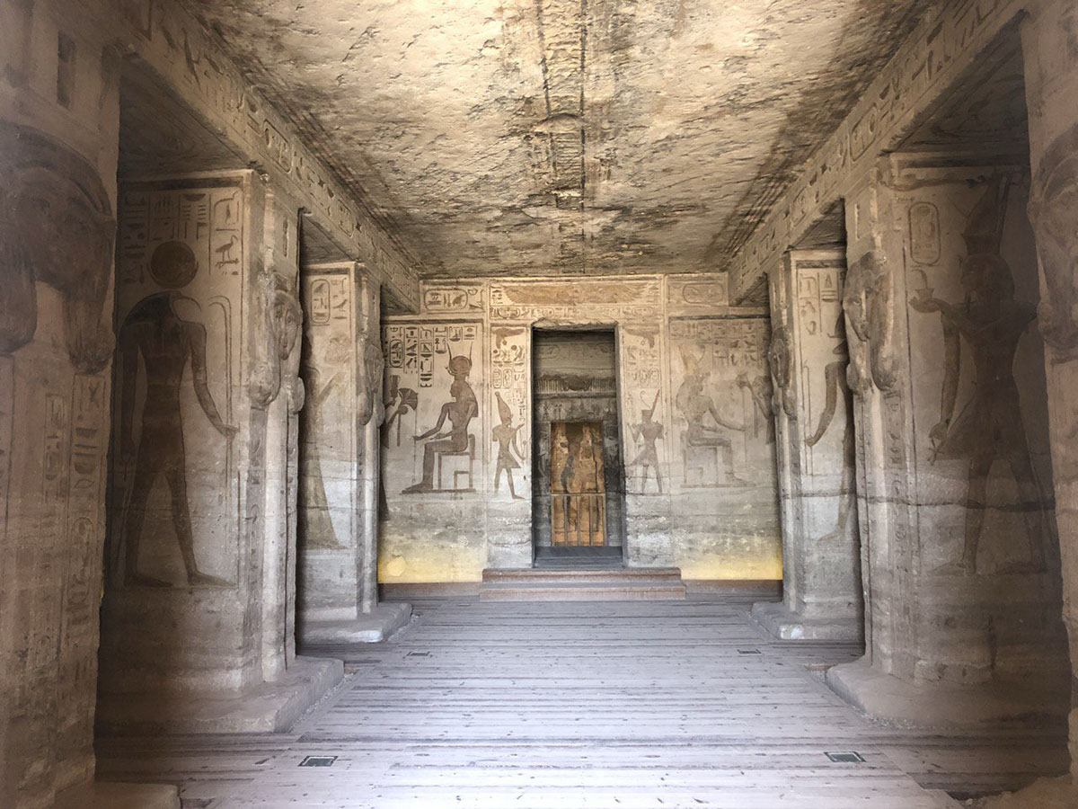 بجانب هذا المعبد الضخم، معبد آخر أنشأه رمسيس الثاني لزوجته الأثيرة الملكة نفرتاري والذي كان مخصصا لعبادة الإلهة حتحور رمز الأمومة. “للزوجة الملكية العظيمة محبوبة موت نفرتاري التي تشرق الشمس من أجلها”. تستقبلك تلك النقوش التي نحتت على مدخل هذا المعبد الفريد. وحيث تقف نفرتاري على مدخل المعبد الأنيق جنبا إلى جنب مع رمسيس في تماثيل منحوتة، تحيطها نقوش بالهيروغليفية من كل جانب.