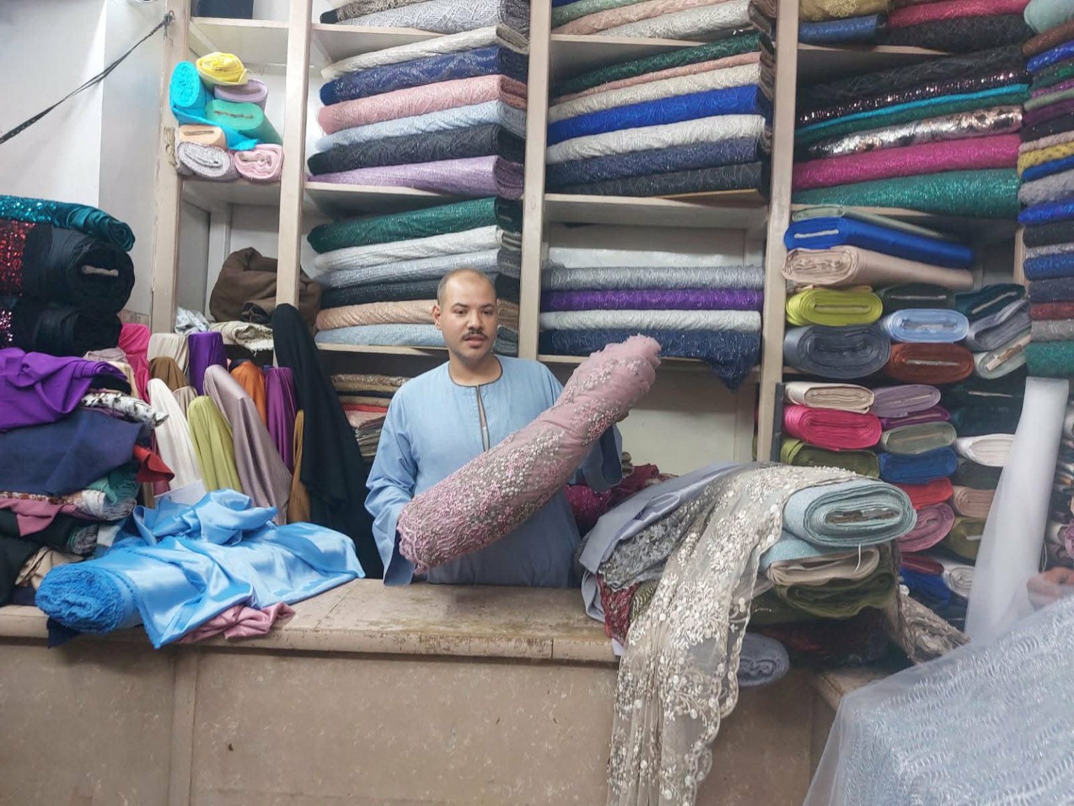 His busiest seasons align with Egypt’s social calendar. Wedding season peaks during New Year’s and Christmas holidays, when brides-to-be hunt for that perfect fabric to transform into an unforgettable gown. The shop fills with women debating between tulle and taffeta, between sequins and embroidery, their voices blending with Al-Arabi’s continued humming.