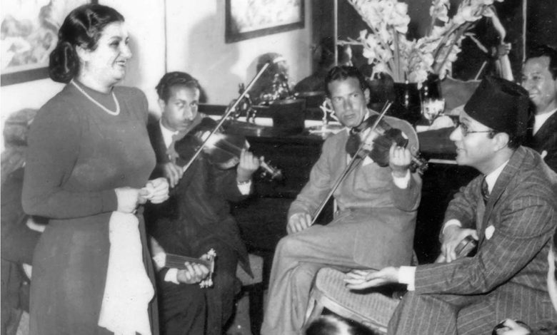 Abdel Wahab came closest to embracing traditional Arab imagery in the “Majnun Layla” operetta from “Happy Day” (1939), which he composed and sang as a duet with Asmahan. In the film, his modern, European-dressed character attends a theatrical performance of Ahmed Shawqi’s play “Majnun Layla” with his beloved Samiha Samih. He then imagines himself as Qays, the legendary lover, appearing in Arab costume opposite Amina El Sherif (voiced by Asmahan) as Layla.