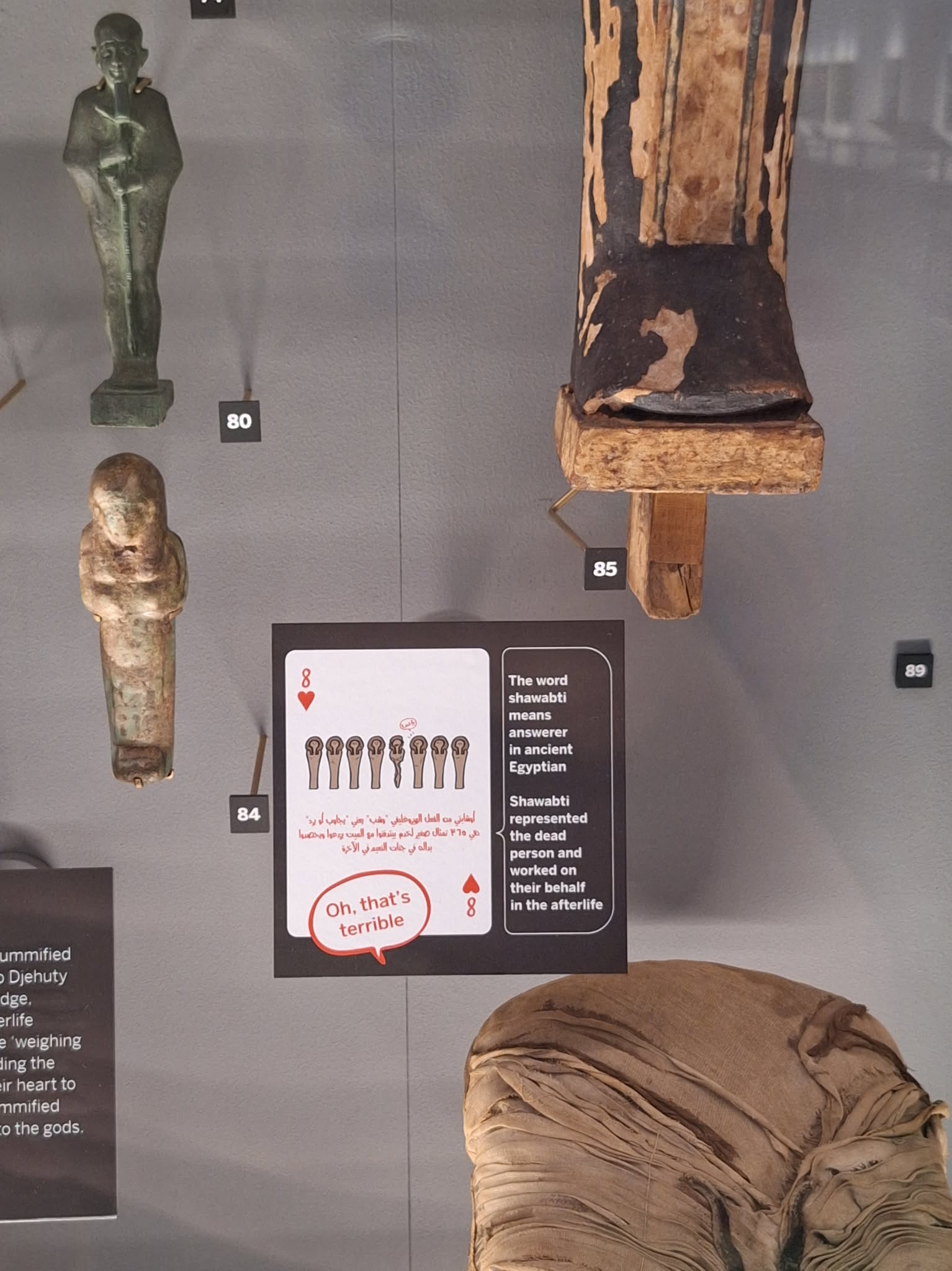 لم يقتصر المشروع على الكوميكس، بل أصدر في عام 2002 لعبة “كوتشينة آثارنا المتغربة”، وهي مستوحاة من قطع أثرية مصرية معروضة في المتاحف الشريكة، من بينها متحف هورنيمان. وقد استُخدم أربعة من هذه البطاقات – المستلهمة من مقتنيات المتحف – ضمن المعرض الحالي، ما أتاح للفريق المصري إعادة صياغة السرد المتحفي من وجهة نظر المصريين، لأول مرة في بريطانيا.