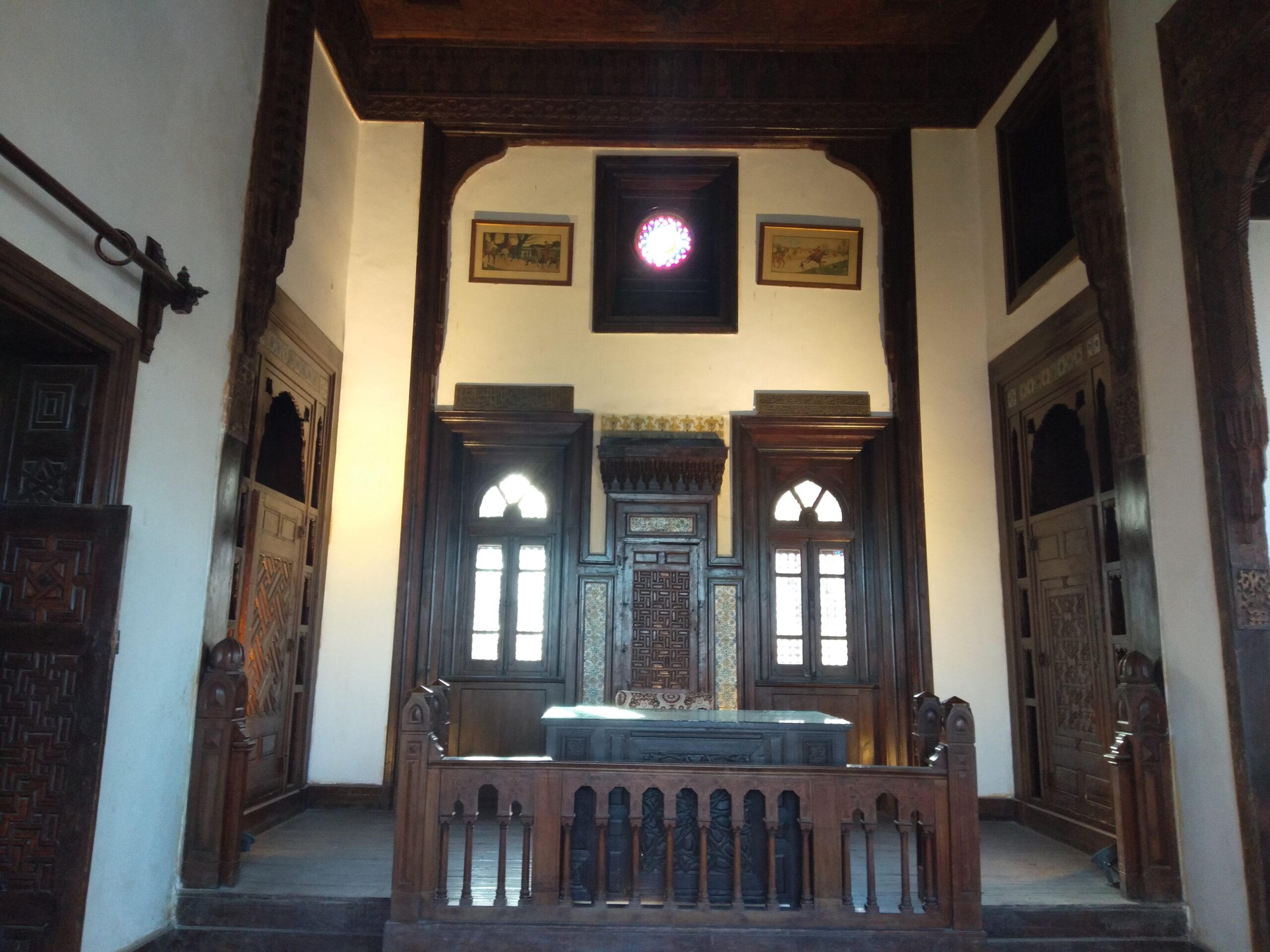 وهناك محرابين ينتميان للعصر المملوكي، ومنقوش عليهما بالخط الكوفي “محمد”، وقطعتين لوحات الفسيفساء، كما تظهر ملامح العصر العثماني في القصر، فهناك جص على قالب وزجاج ملون يضفي شكلا جماليا على ضوء الشمس، كما يفصل هذه القاعة عن المبنى حجاب خشبي.