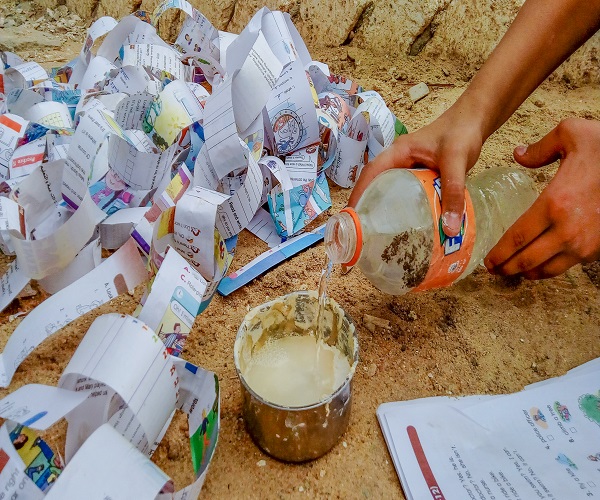 بعض الكتب القديمة والكراسات الملونة كل ما يحتاجه الأطفال لصنع الزينة. ثم تقسيم أنفسهم إلى مجموعات مجموعة لقص الورق لتكوين أشكال هندسية على شكل مثلثات أو دوائر. وأخرى تحضر المادة اللاصقه للصق الورق. وتتكون المادة اللاصقة من “عجينة” تحضر في إناء به ماء ودقيق ويخلطوا سويا لتكوين العجينة. ومجموعة أخرى تقوم بلصق الورق المقصوص مع بعضه فيأتوا بالورق ويلصقوه بالعجينة. وبعد الانتهاء من تحضير الزينة ولصقها يمررو الزينة لمجموعة أخرى من الأطفال والشباب لتعليقها على الحائط.