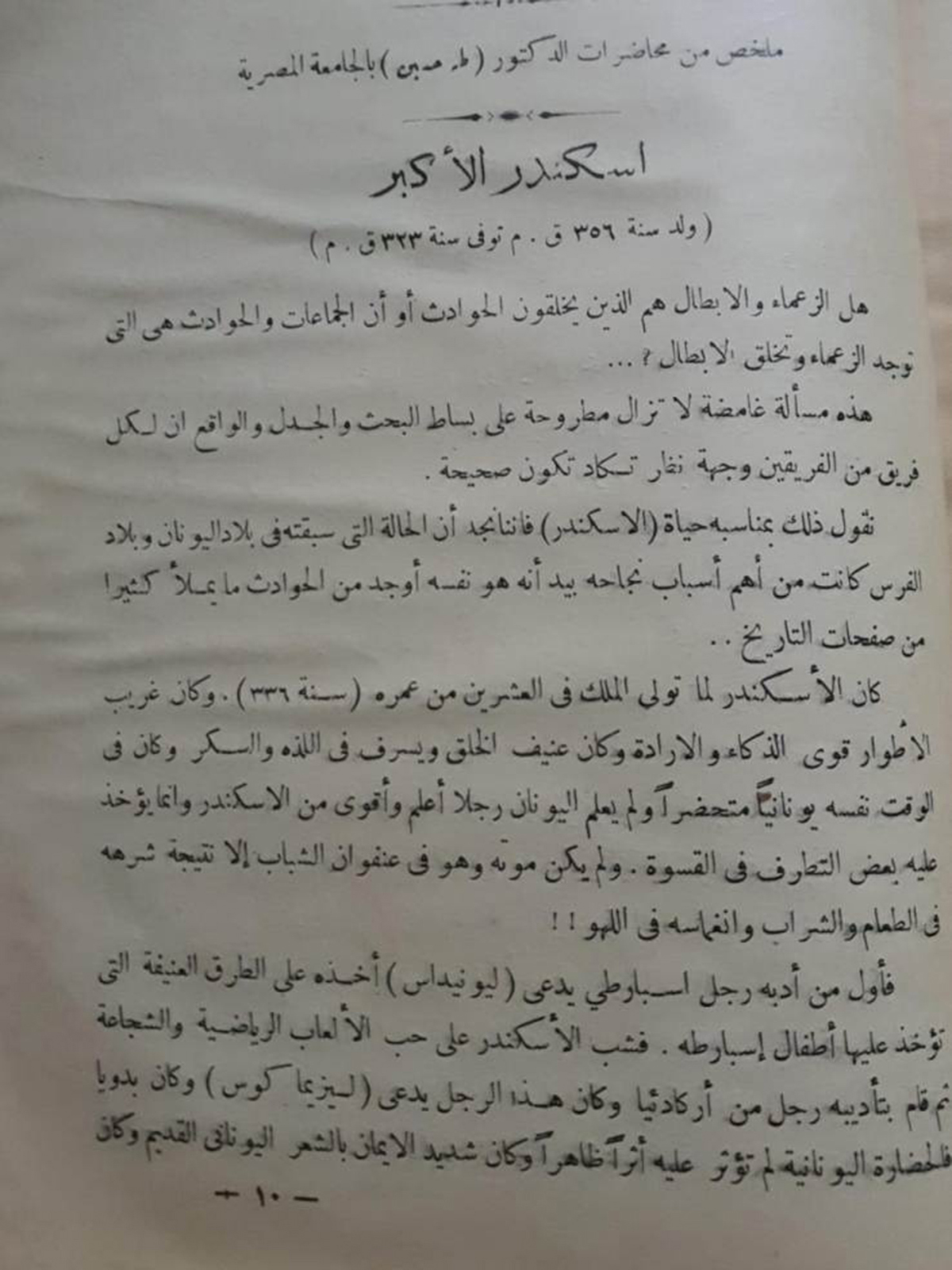 ويستهل طه حسين محاضرته فيقول: “هل الزعماء والأبطال هم الذين يخلقون الحوادث أو أن الجماعات والحوادث هي التي توجد الزعماء وتخلق الأبطال؟ هذه مسألة غامضة لا تزال مطروحة على بساط البحث والجدل. والواقع أن لكل فريق من الفريقين وجهة نظر تكاد تكون صحيحة. نقول ذلك بمناسبة حياة (الإسكندر) فإننا نجد أن الحالة التي سبقته في بلاد اليونان وبلاد الفرس كانت من أهم أسباب نجاحه. كما يبدو أنه هو نفسه أوجد من الحوادث ما يملأ كثيرا من صفحات التاريخ”.