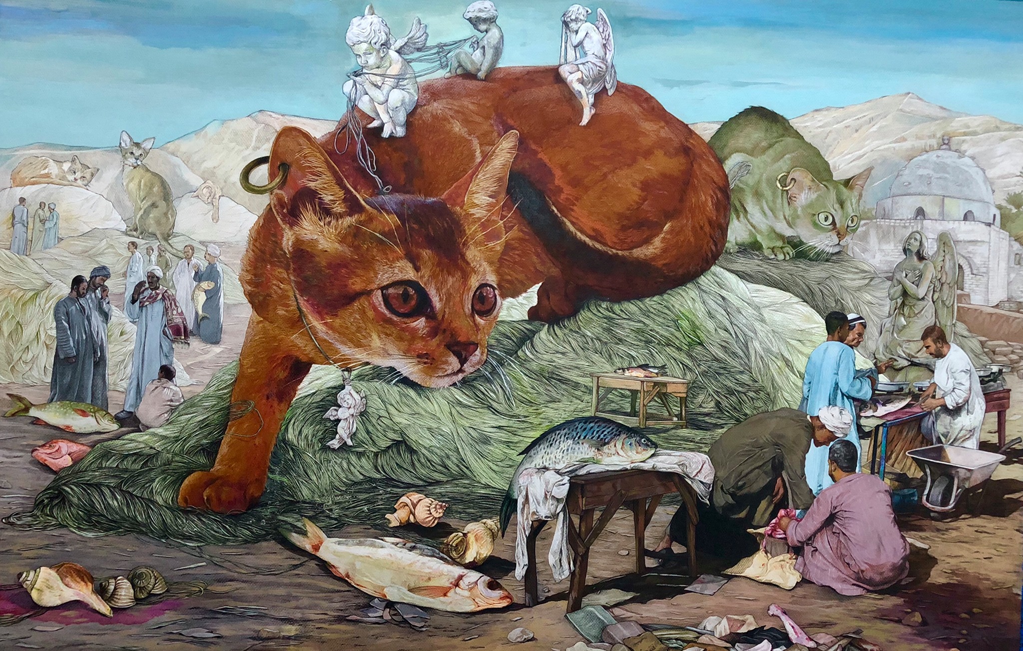 ويضيف، كانت النتيجة رسم لوحة تدور عن فكرة العدالة، بلغ طولها 10 أمتار بارتفاع 3 أمتار، وكانت اللوحة مشروع تخرجي، وهي الآن في مدخل كلية الفنون الجميلة بالأقصر، حيث اقتنتها الجامعة، واستوحيت فكرتها من الآلهة “ماعت”، والربط ما بين الحضارة القديمة والحديثة وكان الرابط هو النيل، ووضعني هذا المشروع على بداية الطريق، فبدأت قراءة التاريخ بشكل مختلف والتعرف على أساطيره وحكاياته.
