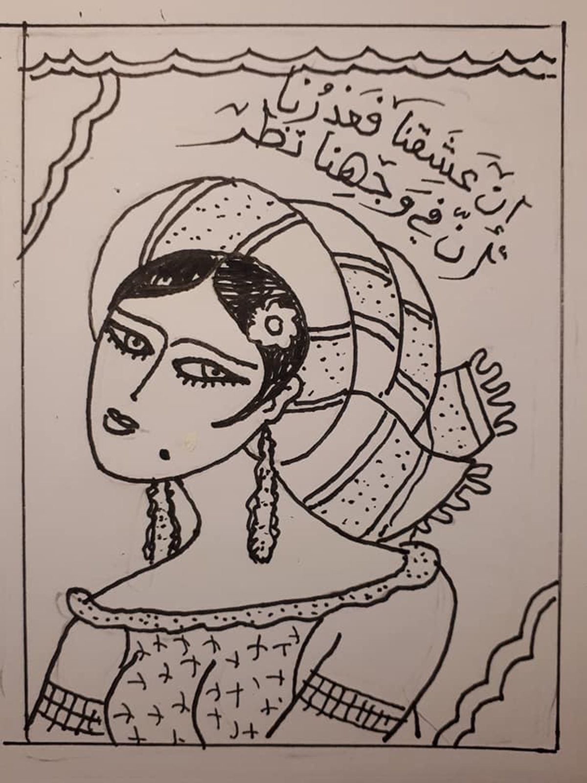 وتصورها دعاء العدل وهي ترسم في منتصف اللوحة بورتريه للفنان الراحل حلمي التوني. بينما على يسار اللوحة هدهدان يحلقان قرب البورتريه وكأنما يحرسانه ويحييانه. الفتاة/السفيرة عزيزة، مرتدية الأحمر، واضعة كحلا كثيفا يحدد عينيين واسعتين، والسمكة التي تكلل رأسها، والهدهد. كل هذه مفردات فولكلورية مصرية قديمة: العين الفرعونية والسمكة القبطية والهدهد المسلم. كلها مفردات استعادها التوني وصبغها بصبغة الفن التلقائي وفن البوب أو البوب آرت.