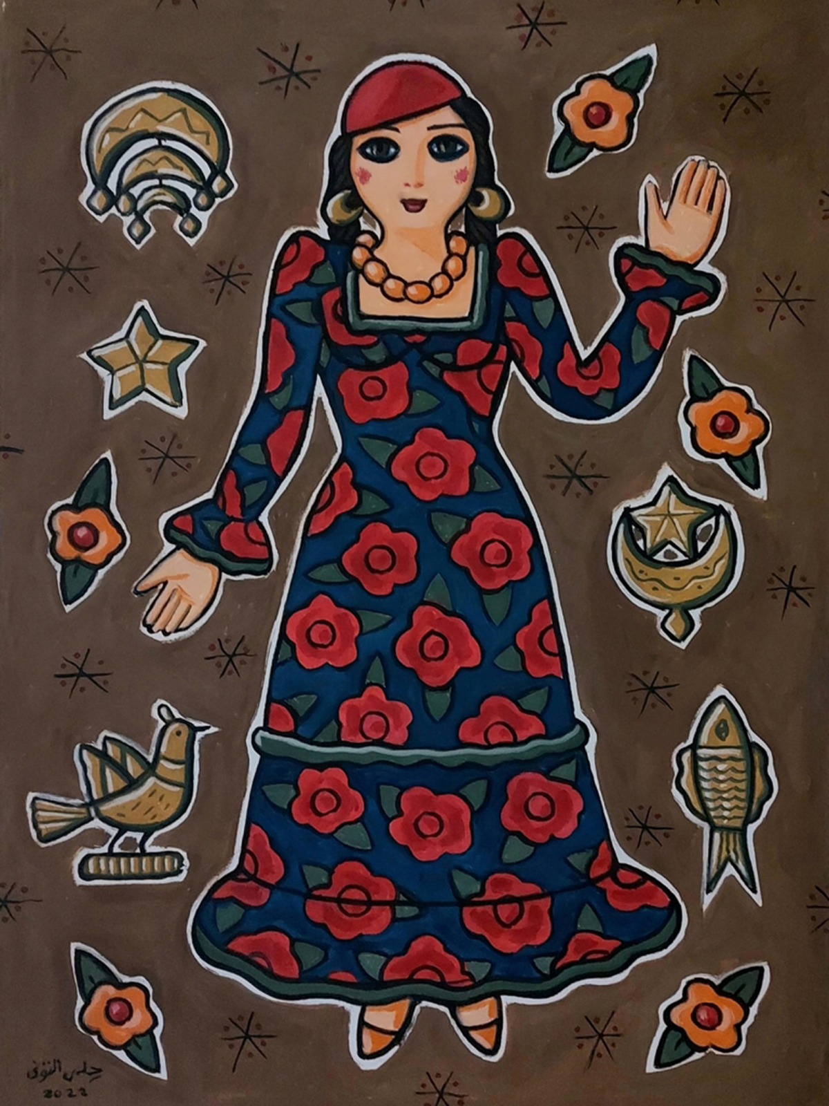 على سبيل المثال، للتوني لوحة تصور امرأة ترقص وقد حملت على رأسها صينية عليها شموع وتضرب بيدها دفا وهي في موقف فرح واحتفال بعرس. تكلل جسدها من أعلى جمل من أغنية أفراح شعبية شهيرة: “لابسة الما شا الله يا ما شا الله عليها/ ست العرايس والشموع حواليها”. وفي المقابل، وبسبب حضور فلسطين الطاغي في حياتنا منذ أكتوبر 2023، تضاعفت شعبية لوحة للتوني. كثر تداولها على الإنترنت مؤخرا، تتصدرها امرأة بثوب فلسطيني يغلب عليه اللون الأزرق. تحتضن ما يبدو نموذجا مصغرا للقدس وبجوار ساقها سطر من أغنية فيروز الشهيرة عن المدينة الحلم: “عيوننا إليك ترحل كل يوم”.