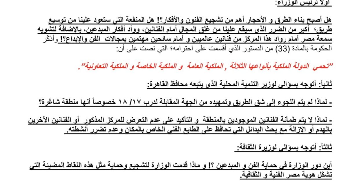واستكمل: “أذكّر الحكومة بالمادة 33 من الدستور الذي أقسمت على احترامه، التي نصت على أن تحمي الدولة الملكية بأنواعها الثلاثة الملكية العامة والملكية الخاصة والملكية التعاونية، وأين دور الوزارة في حماية الفن والمبدعين؟ وماذا قدمت لتشجيع وحماية مثل هذه النقاط المضيئة التي تشكَل هوية مصر الفنية والثقافية؟”.