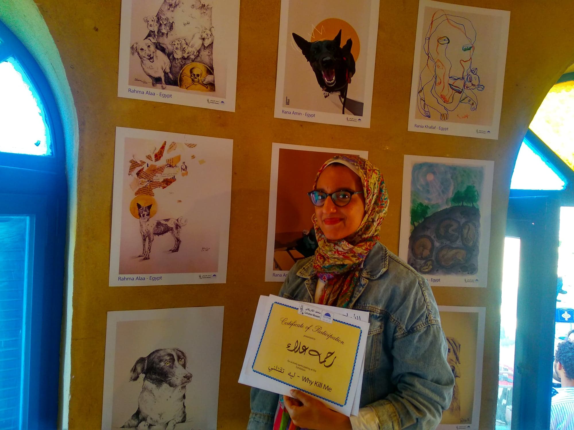 فازت بالجائزة الأولى في مسابقة الكاريكاتير الفنانة رحمة علاء، الحاصلة على ماجستير كلية الفنون التطبيقية، والتي شاركت في العديد من المعارض. تقول رحمة: نشأت منذ كنت صغيرة في أسرة زرعت بداخلي أنا وأخواتي حب الحيوانات والرأفة والعطف عليهم، وكنت أرى والدي وهو يطعم كلاب الشوارع، ودائما ما كنا نفعل ذلك معه، وكنت أرى كثيرا الكلاب في الشارع وهي ميتة، ولم يكن في مقدوري مساعدتها، لذا عندما سمعت عن المسابقة شاركت وكلي سعادة حتى وإن كانت مشاركتي من خلال رسوماتي هي أقل ما يمكن عمله، وحصولي على الجائزة الأولى أسعدني جدا بجانب سعادتي بالمشاركة في المعرض، وأتمنى عدم التعامل بعنف مع الحيوانات وأن تتم معاملتها بطريقة أفضل.