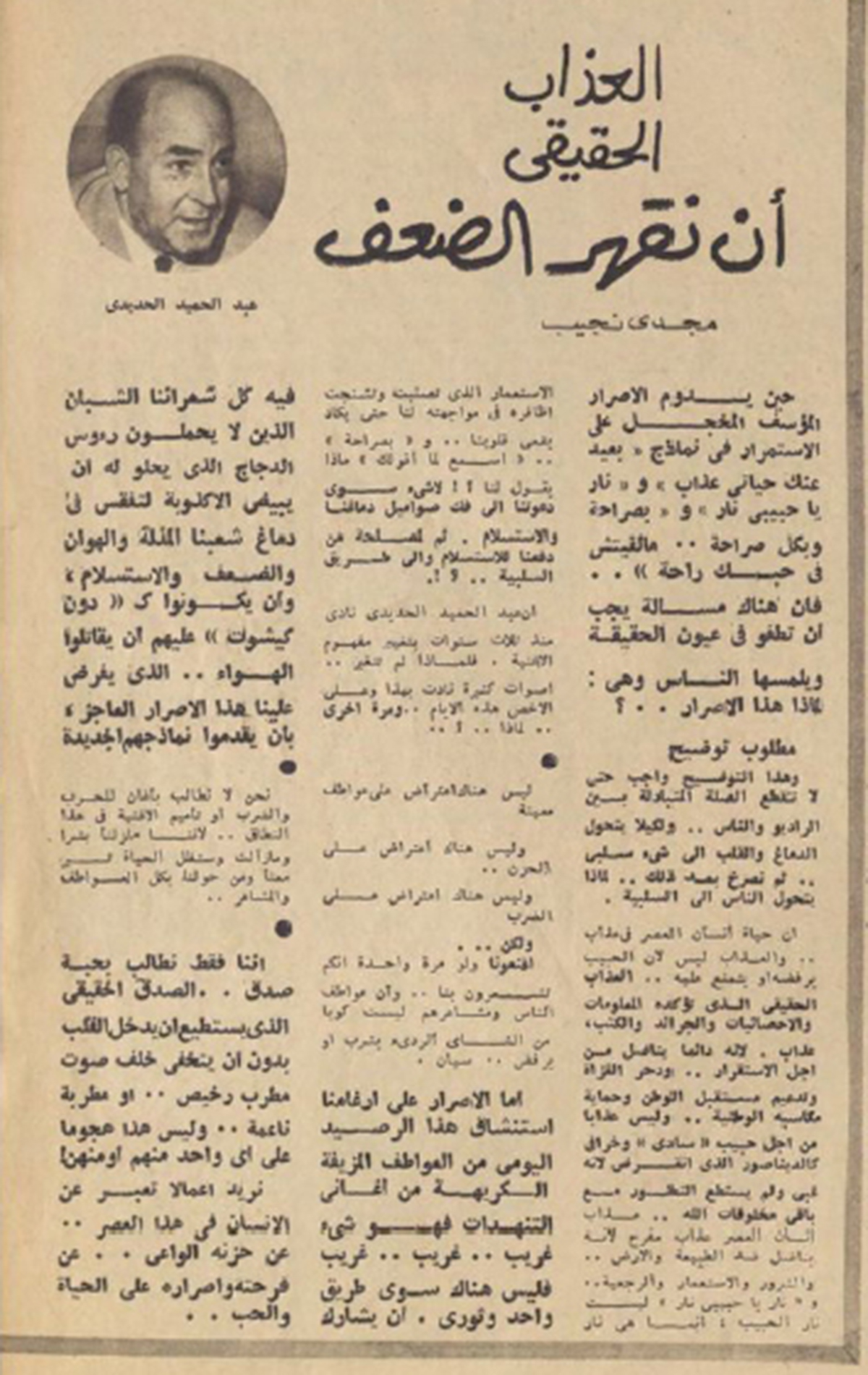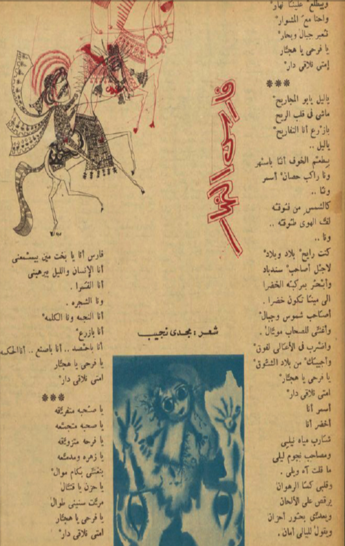 فقد أصبح الشعر العامي الآن المعبر الأول عن الآمال والآلام التي تتحرك في نفوس شعبنا. ومنذ أسابيع ظهر ديوان جديد لشاعر جديد فتحت له صباح الخير صفحاتها منذ حوالي سنة. هذا الشاعر هو مجدي نجيب وجاء مجدي يحمل لنا الديوان وعلى قدر الفرحة التي ملأت نفوسنا بالديوان كان تحفظنا أمامهن. فظهور ديوان من الشعر العامي هو بلا شك وثيقة تدين الحركة وتقيمها. والديوان ليس كالقصائد المتناثرة فعلى الرغم من أن جمهور قرائه قد يكون أقل من جمهور قراء المجلة إلا أن أثر الديوان أبعد مدى”.