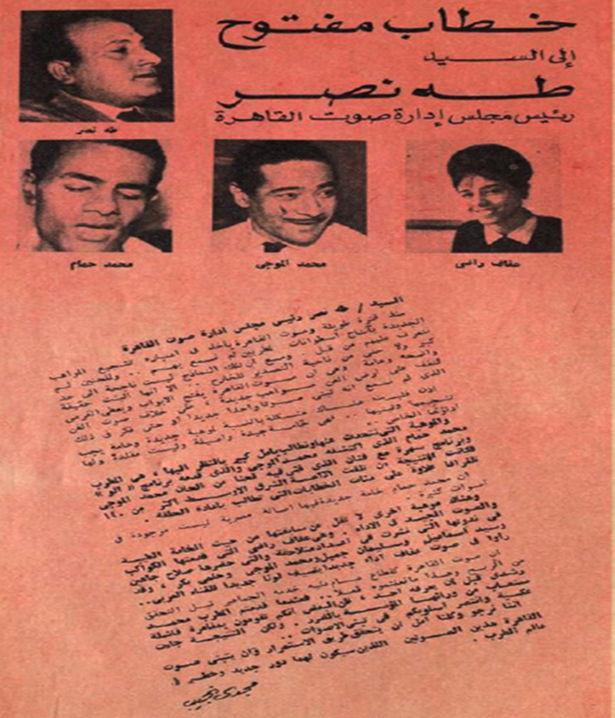 ويرسل خطاب مفتوح إلى “فاروق خورشيد” مدير إذاعة الشعب يعتب عليه كثرة المادة الكلامية غير الجذابة والتي يعجز المستمع عن الصمود للإنصات لها وقلة المواد التمثيلية الجديدة، لأن معظم ما يقدم للإذاعة مواد قديمة.