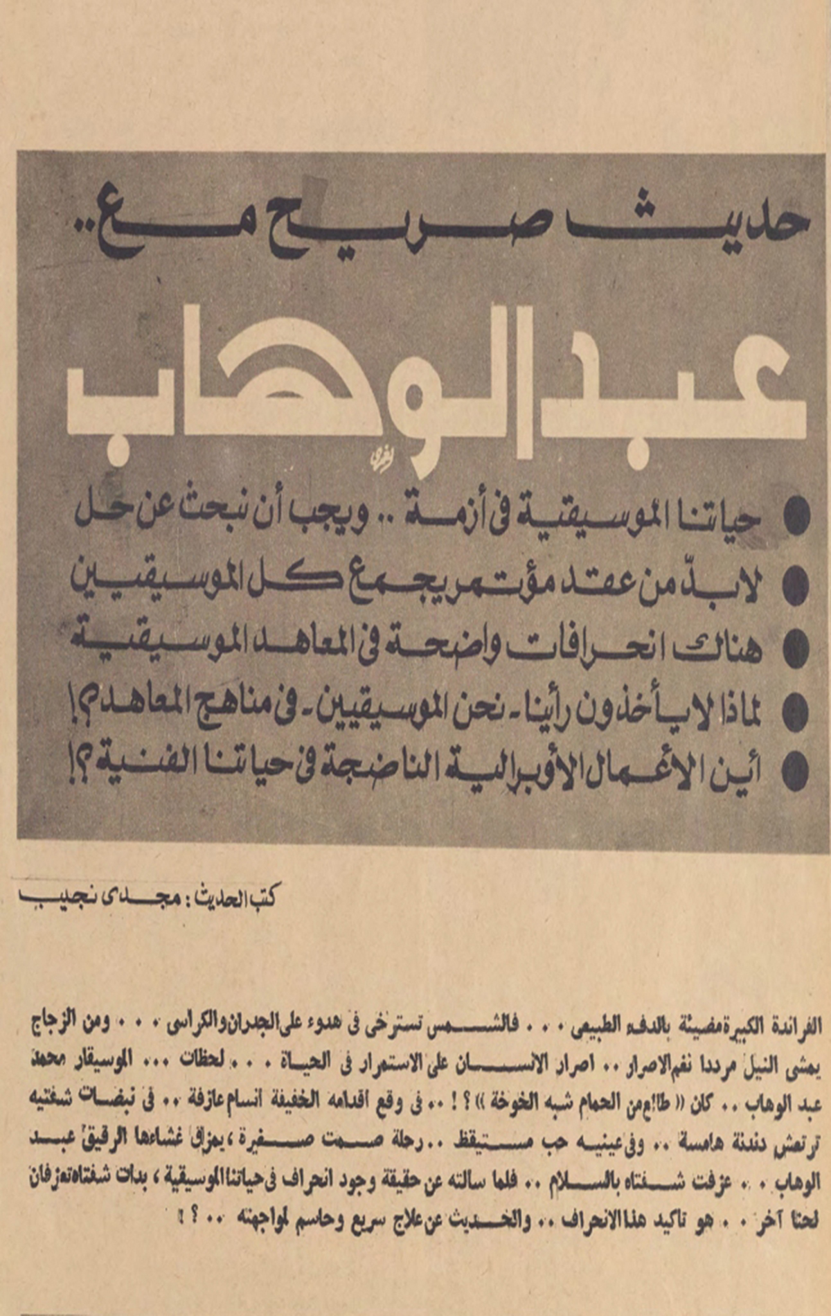 بعد النكسة هاجم مجدي نجيب بعنف نوعية الأغاني التي تذاع في محطة الإذاعة. وذلك في مقال بعنوان: “العذاب الحقيقي أن نقهر الضعف”. بدأ مقاله متسائلا عن الإصرار المؤسف المخجل على الاستمرار في نماذج “بعيد عنك حياتي عذاب” و”نار يا حبيبي نار” و”بصراحة بكل صراحة مالقتيش في حبك راحة”. ويتابع تساؤلاته: “لما الإصرار على إرغامنا استنشاق هذا الرصيد اليومي من العواطف المزيفة الكريهة من أغاني التنهدات؟”.