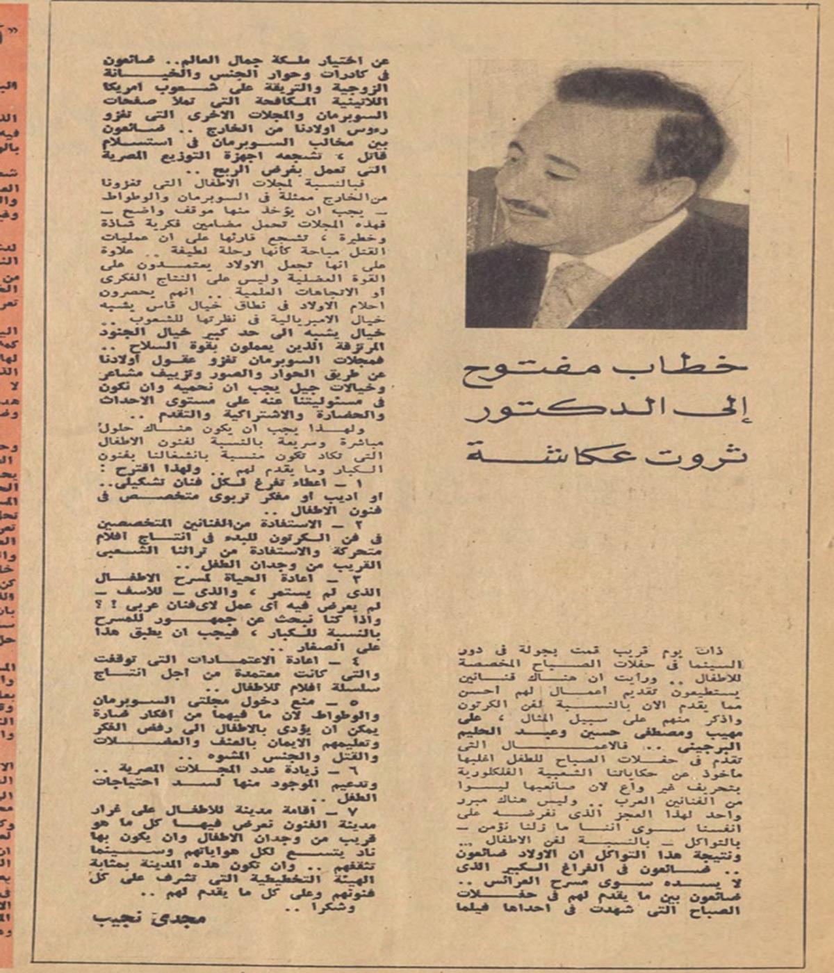 ويكتب أيضا خطاب مفتوح إلى الدكتور ثروت عكاشة، وزير الثقافة، يتحدث فيه عن سينما الطفل ومدى العجز الكبير الموجود في هذا المجال. والاعتماد على شخصيات أجنبية مثل سوبر مان والرجل الوطواط وما فيهم من أفكار ضارة تعلم الأطفال العنف والقتل. ويطلب من الوزير إقامة مدينة للأطفال على غرار مدينة الفنون نعرض فيها كل ما هو قريب من وجدان الطفل العربي.