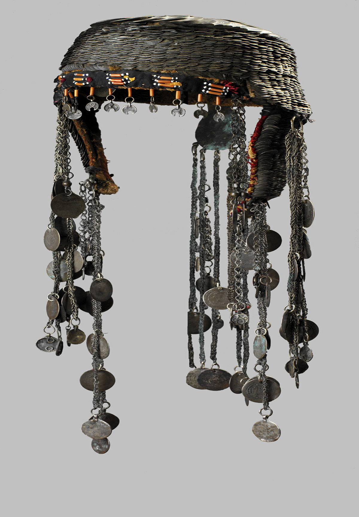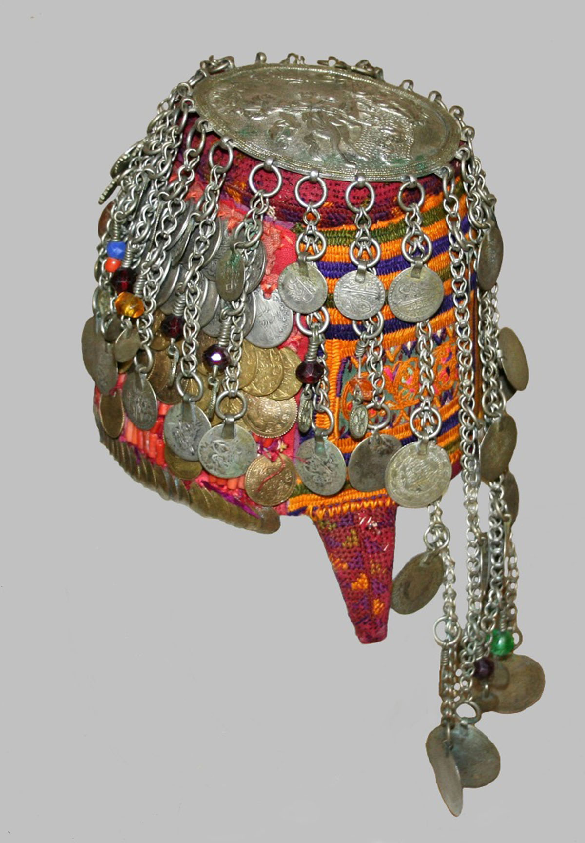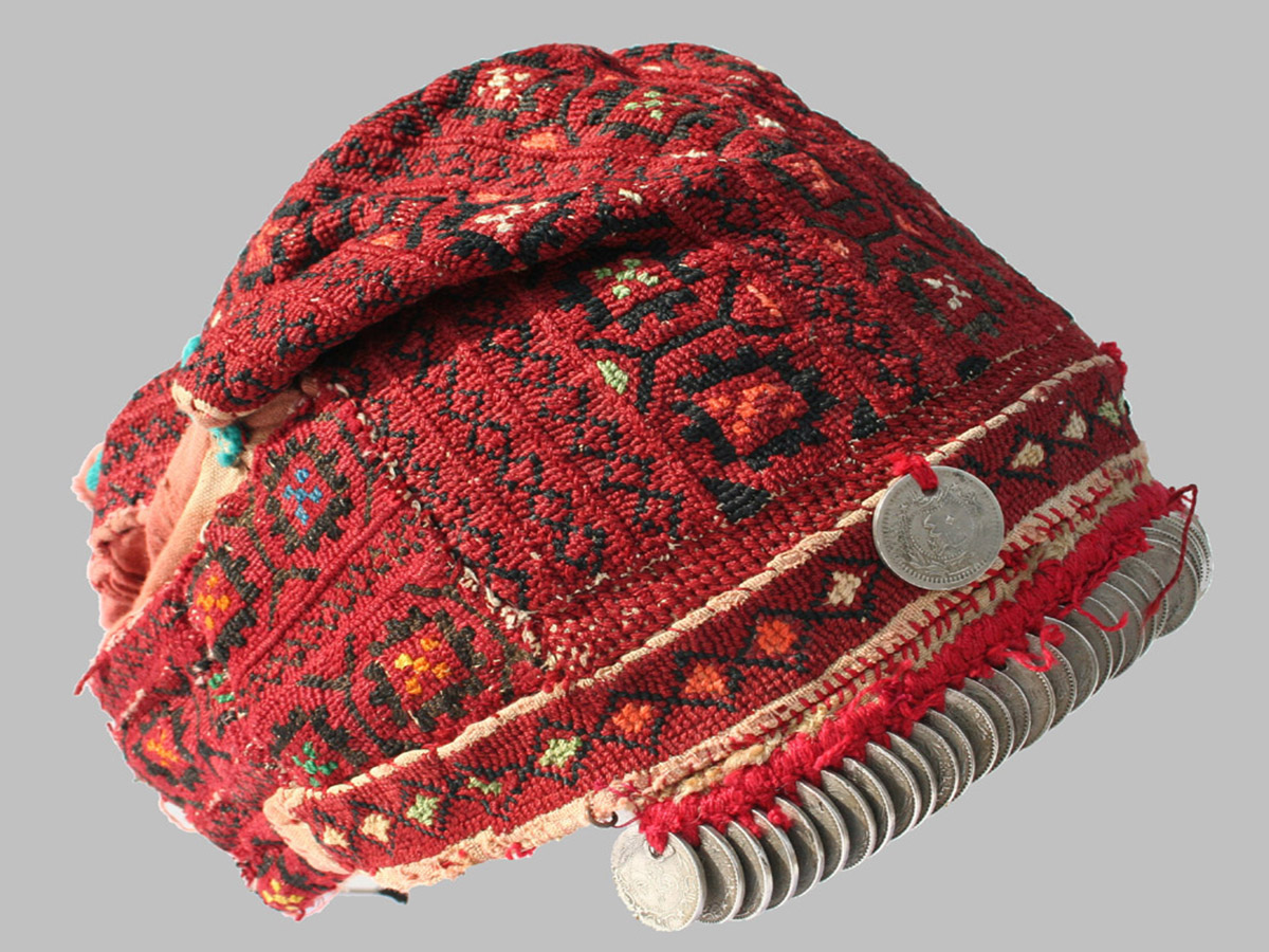 وقطع أخرى قد تشاهدها للمرة الأولى، لقبعة مخروطية الشكل مرصعة بالعملات العثمانية والخرز المرجاني والتطريز الحريري. وكلها مرتبطة بالمجوهرات الفضية الرقيقة التي كان من المفترض أن تتدلى فوق فستانها.