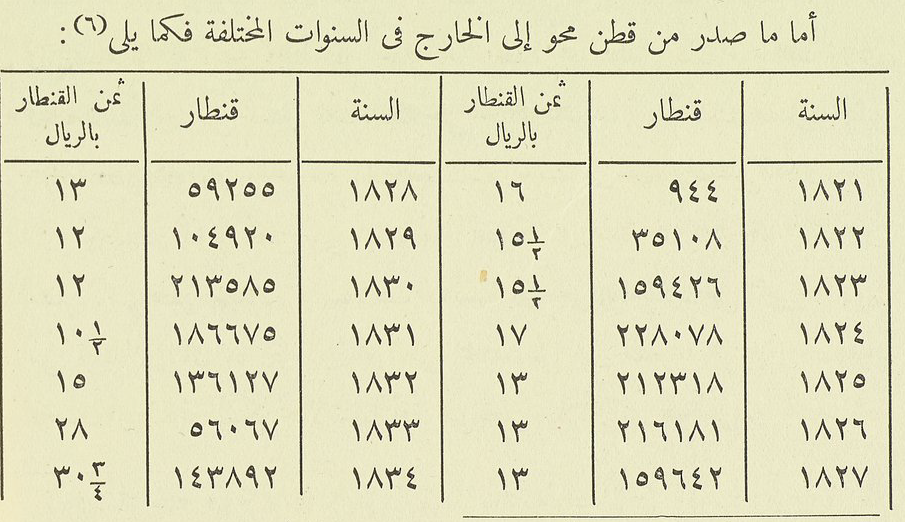 يقول الدكتور مصطفى البهتيمي، في كتابه «تاريخ زراعة القطن في مصر»: إن شركة «إيوارت ماير» المتخصصة في صناعة النسيج ذكرت في تقريرها السنوي الصادر في 31 ديسمبر 1823م، أن 3 آلاف بالة قطن وردت من مصر في هذا العام، ويُنتظر ورود كميات منتظمة من هذا القطن، ووصف التقرير القطن المصري بأنه طويل وناعم التيلة، ولكنه أغبر ولم يُعنَ بنظافته، لم يذكر قيمة تلك الواردات وقيمتها.