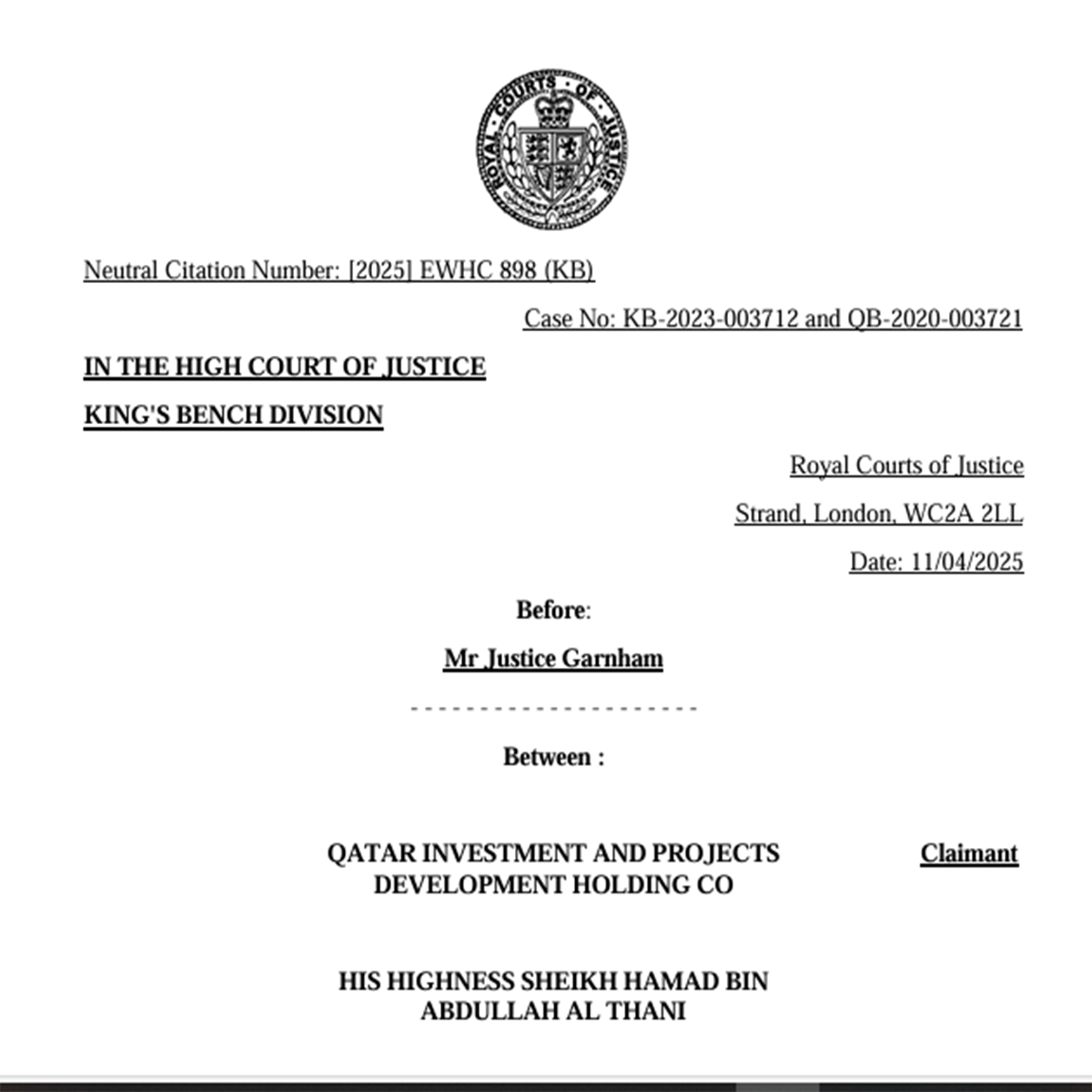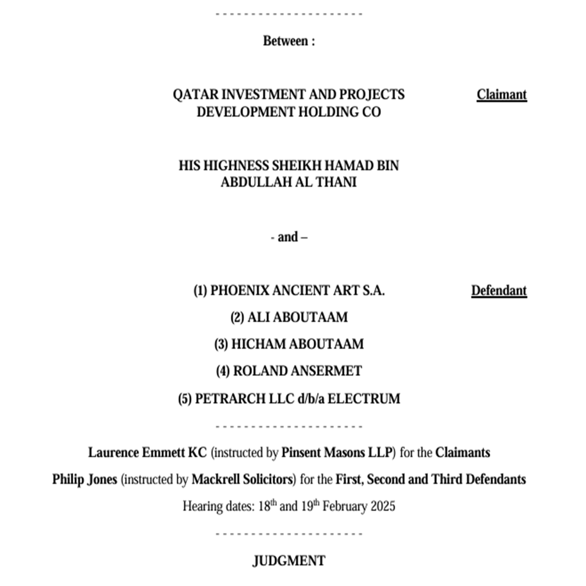 حصل «باب مصر» على مذكرة التحقيق الصادرة الشهر الماضي عن المحاكم الملكية للعدل في لندن، للقضية التي تحمل الرقمين (KB- 2023- 003712 and QB – 2020-003721) الصادرة عن المحاكم الملكية للعدل لندن. قدمت الشكوى شركة قطر للاستثمار وتطوير المشاريع القابضة، عن ممثلها الشيخ حمد بن عبدالله آل ثاني. ضد شركة فينيكس للفنون القديمة. والشقيقين علي وهشام أبو طعام، ورولاند أنسيرميت، وشركة بترارك المعروفة باسم “إلكتروم”.