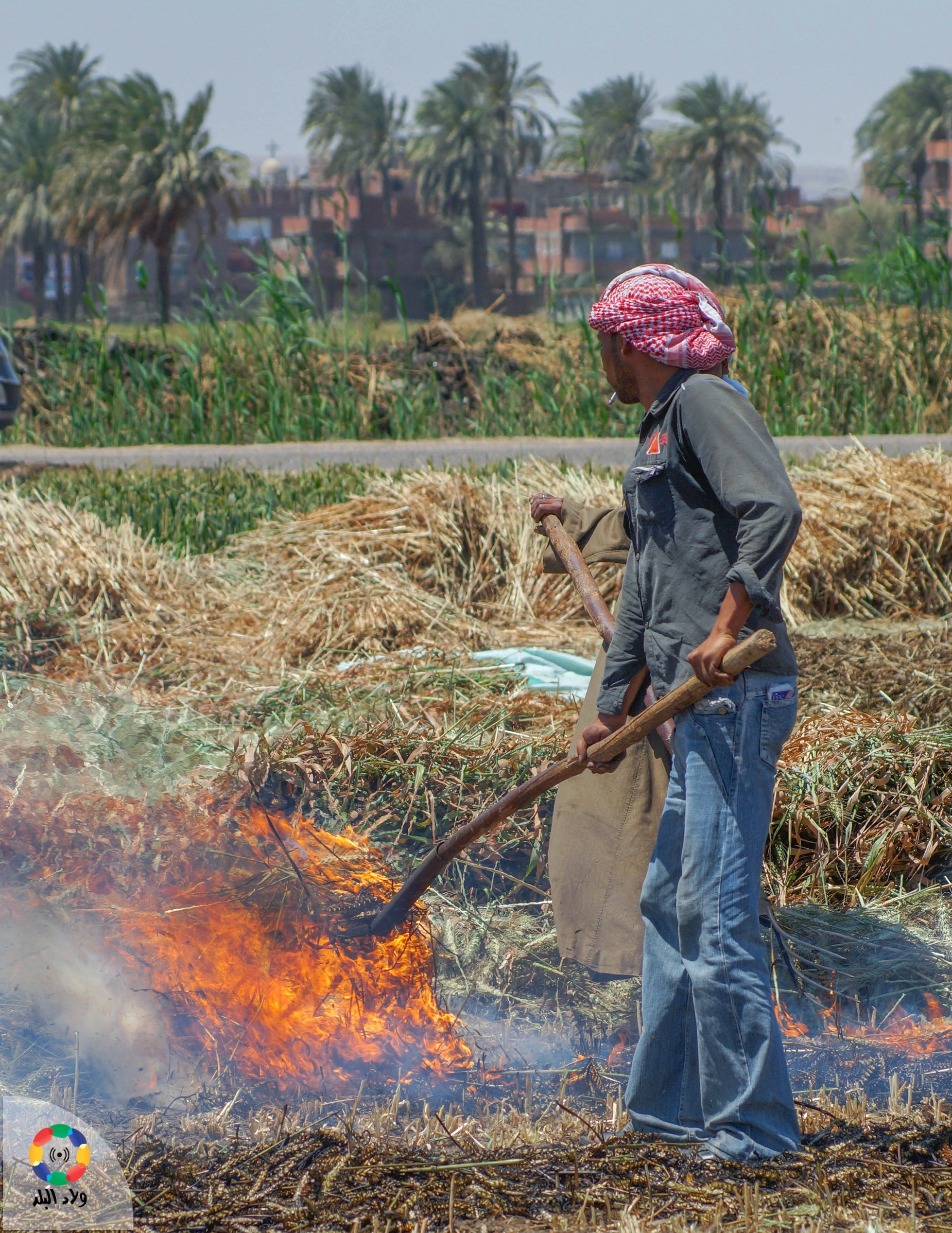 يضيف: بعد الانتهاء من عملية الحرق تترك تلك السنابل علي الأرض حتى نهاية اليوم، ثم تُجمع بواسطة آداه يطلق عليها “شوكة”، وهي تشبه أسنان المشط، وبعدها تنقل تلك السنابل إلي مكان آخر يطلق عليه المصطاح، وتترك تلك السنابل المحروقة يومين أو ثلاثة، وبعدها “تُدرس” بماكينة دراسة القمح.