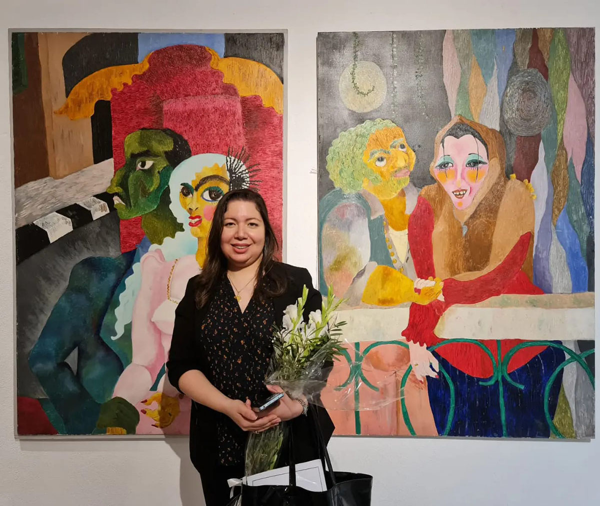 وتضيف، اللوحات التي أشارك بها تعكس الخصائص التي تميز أعمالي الحالية وأسلوبي الفني. حيث إنها ثنائية تواصل، تمثل حالة إنسانية خالصة من الفن التشخيصي متأثرة بفنون مصر القديمة التي طالما أبهرتني، وهي بمثابة كنز لا يفنى من الفكر والإلهام. ويظهر هذا التأثر في وضع الجلوس الأمامي الصدر وجانبي الوجه والأرجل وبالطبع في ملامح الوجه بشخوص لوحاتي.