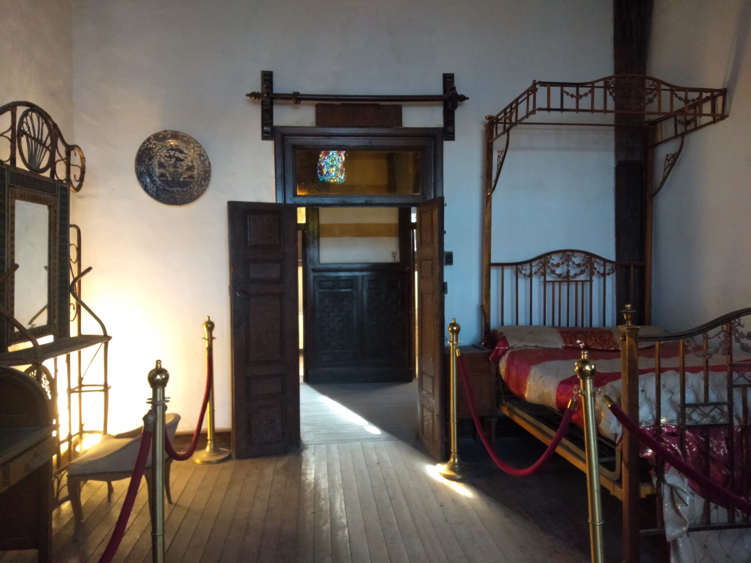 وهناك محرابين ينتميان للعصر المملوكي، ومنقوش عليهما بالخط الكوفي “محمد”، وقطعتين لوحات الفسيفساء، كما تظهر ملامح العصر العثماني في القصر، فهناك جص على قالب وزجاج ملون يضفي شكلا جماليا على ضوء الشمس، كما يفصل هذه القاعة عن المبنى حجاب خشبي.