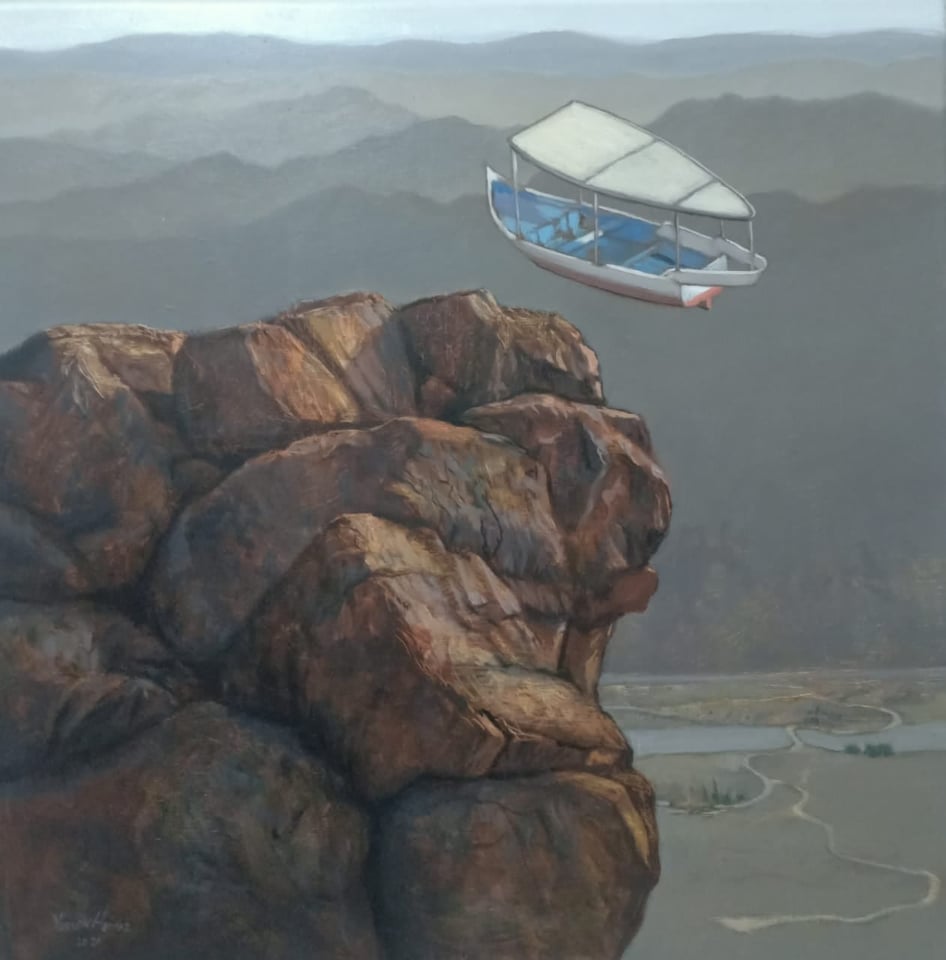يكمل حراز، المعرض يخالف المنطقية الطبيعية. لكنه ليس مخالفًا للخيال الفني، وهو نوع من الرومانسية والغرابة والدهشة، فوجود الطيور والورود التي تعبر عن الرومانسية والحب والجمال في الأماكن القاسية مثل الصحراء، وما بها من صخور هو عبارة عن أمنيات وأحلام وخيال. ويظهر في بعض اللوحات السحاب كبطل للوحة، ونقلته من السماء ووضعت بدلًا منه مراكب على سبيل المثال وهو أسفلها.