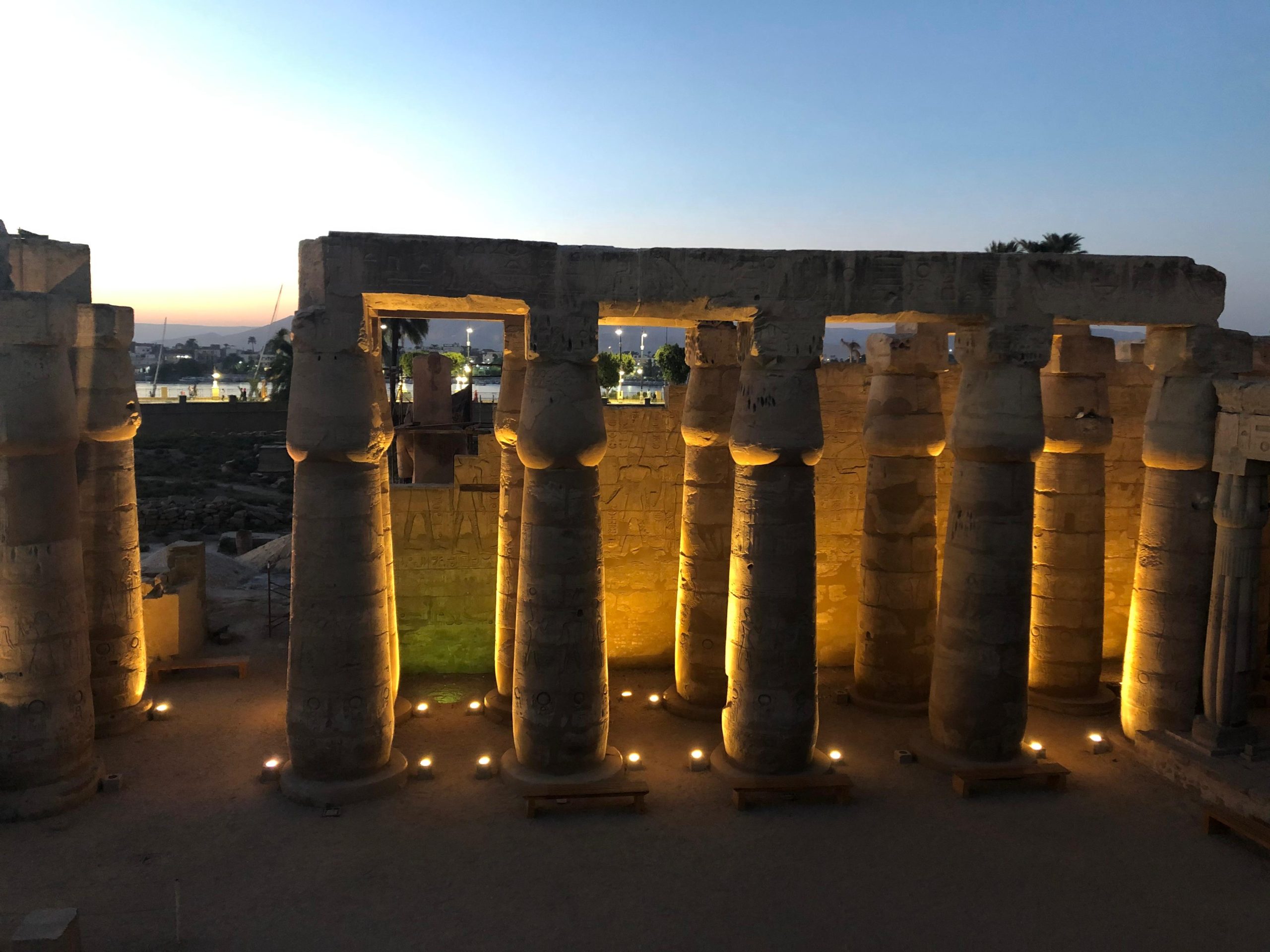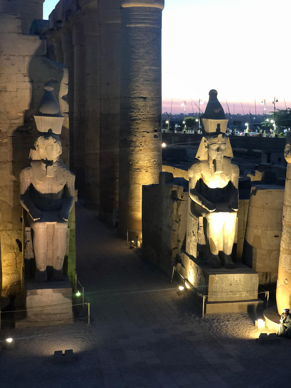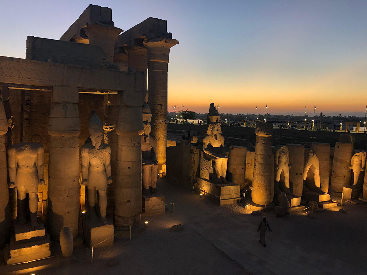 يمكنك الوصول إلى معبد الأقصر عبر أحد الطريقين، إما عن طريق النيل مثل ما كان يصل الإله آمون، أو عن طريق ممر الكباش الذي يربط المعبدين بعضهما البعض. صحيح أنهما معبدان إلا أنهما يمثلان جزءا واحدا لتاريخ واحد وعبادة واحدة، تدخل إلى معبد الأقصر عن طريق صرح ضخم شيده الملك رمسيس الثاني وخلد ذكره بستة تماثيل أمامه.