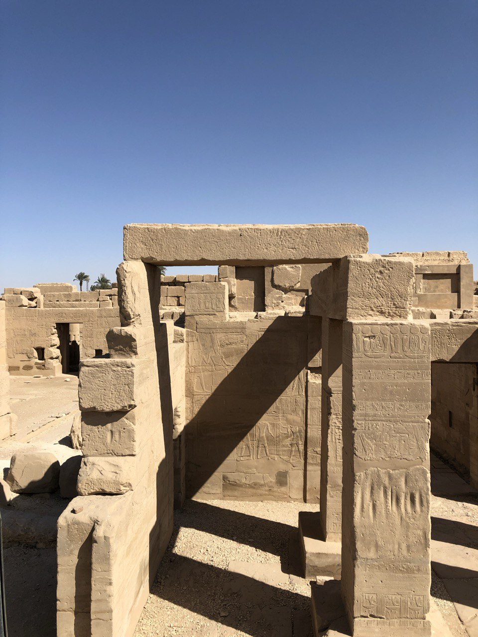 يحفل هذا المعبد المهيب بالعديد من الرسومات والنقوش الجميلة التي تحتفظ بألوانها الزاهية كما هي. فخلف الصرح تقع المقاصير التي مثلت آلهة مصر القديمة. فما بين رع إله الشمس يعطي مفتاح الحياة إلى ملك وما بين حالة تعبد إلى آمون يخضع إليها رمسيس الثالث يتكون هذا المعبد ويقوم في حالة من الرهبة والمهابة.