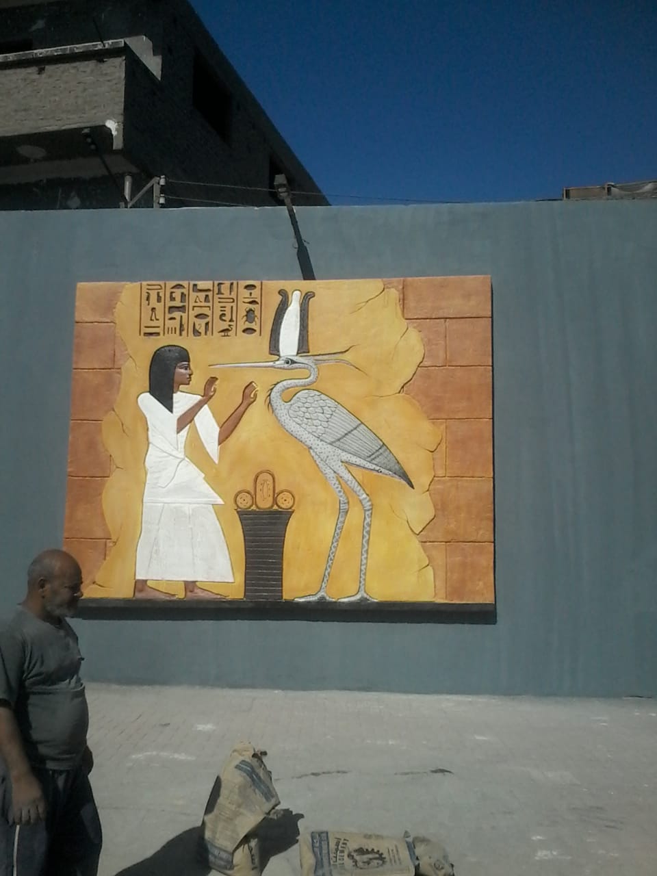 يقول الفنان عبدالرسول أحمد علي، وشهرته «عبده الجبلاوي»: صممت الجدارية بالفطرة، وهي عبارة عن أشكال نحتية تنتمي للمصريين القدماء، المحارب المصري مع العجلات الحربية قديما، وبها نقوش وحروف فرعونية، وأيضا بعض القطع التي تعبر ثقافة وتراث محافظة قنا بامتداد 106 مترا على السور.