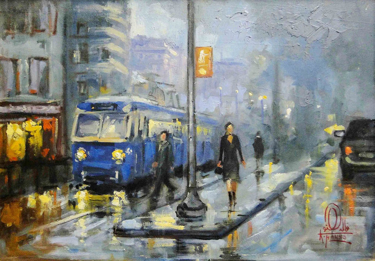 سألناه: في لوحاتك هناك حركة في الشارع.. حركة الناس والسيارات، لكن أحيانا نشعر أنها حركة لا تنتمي إلى فكرة التفاعل مع الحياة بقدر ما هي حركة شبحية، من الممكن أن تغادر أو تذهب إلى الماضي.. كلوحة الحنطور في شوارع وسط البلد في ظلام الليل؟