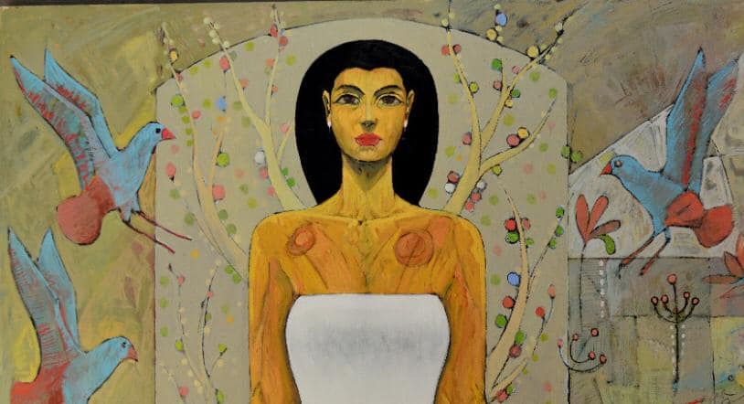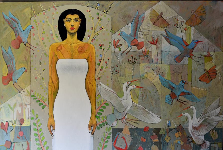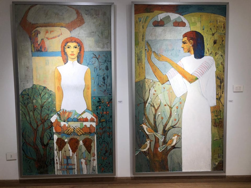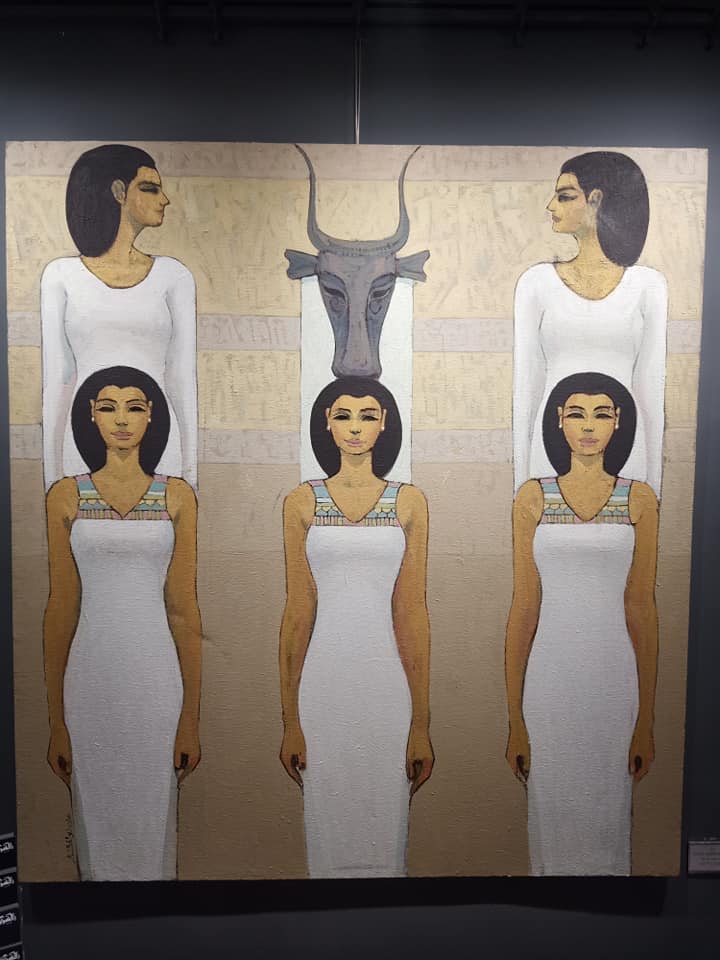 وتابع: تتمثل القصة في موت أوزوريس وبحث إيزيس عنه ومحاولة تجميع أشلائه مرة أخرى، وصورتها في لوحاتي وهي تنتظره وهي تلبس الرداء الأبيض رمز النقاء والطهارة، ومعها القرابين من رمان ونباتات البردي وطيور اليارو المصرية القديمة التي توجد في حدائق اليارو والتي تمثل الجنة لدى المصري القديم.