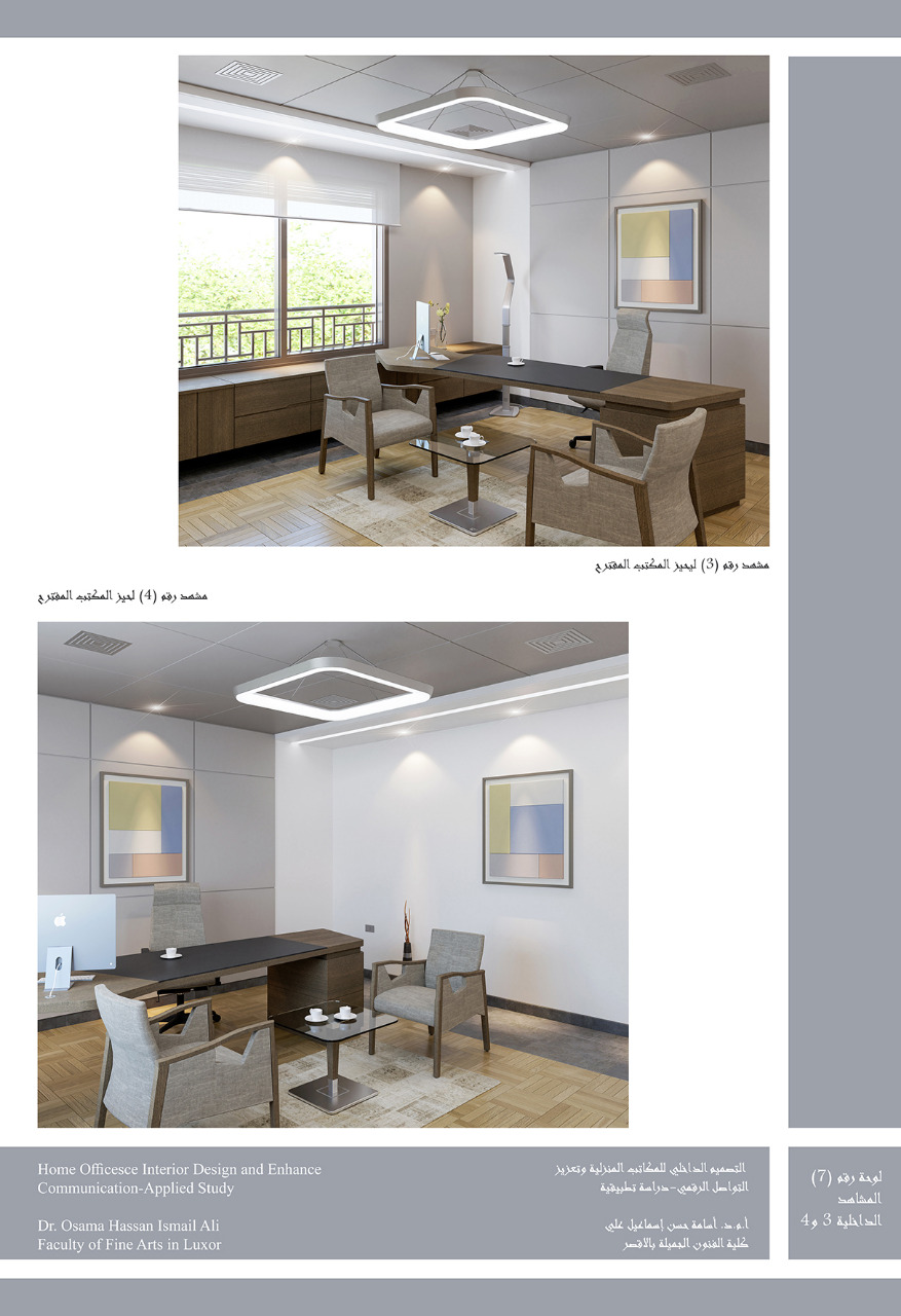 أما المعرض الثالث، فينتقل بزواره إلى عالم الديكور والتصميم. إذ يحمل عنوان “التصميم الداخلي.. وتعزيز التواصل الرقمي”. ويعرض 12 لوحة وتصميما للفنان الدكتور أسامة حسن. وتعالج بعض ما فرضته جائحة كورونا من ظروف أكدت الحاجة إلى تعزيز التواصل بين البشر عبر المواقع المختلفة على شبكة الانترنت وشبكات التواصل الاجتماعي، وفرض العمل بالمنزل على الكثير من العاملين.