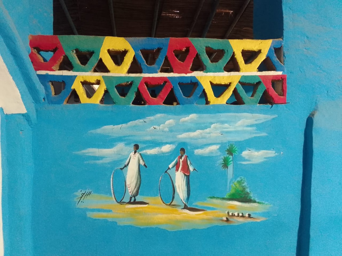 ويتابع أن المنازل حاليًا تُطلى بألوان مائية زاهية مثل الأصفر والأحمر والأخضر والأزرق والأبيض، ولكل لون دلالته. فالأصفر يرمز إلى الرمل، والأخضر إلى الطبيعة، والأزرق إلى السماء ونهر النيل. كما تزين البيوت من الداخل والخارج برسومات تعبر عن الحضارة والتراث النوبي والحياة اليومية. مثل مراكب نهر النيل، والأطفال أثناء اللعب، والحجاج بعد عودتهم من أداء فريضة الحج.