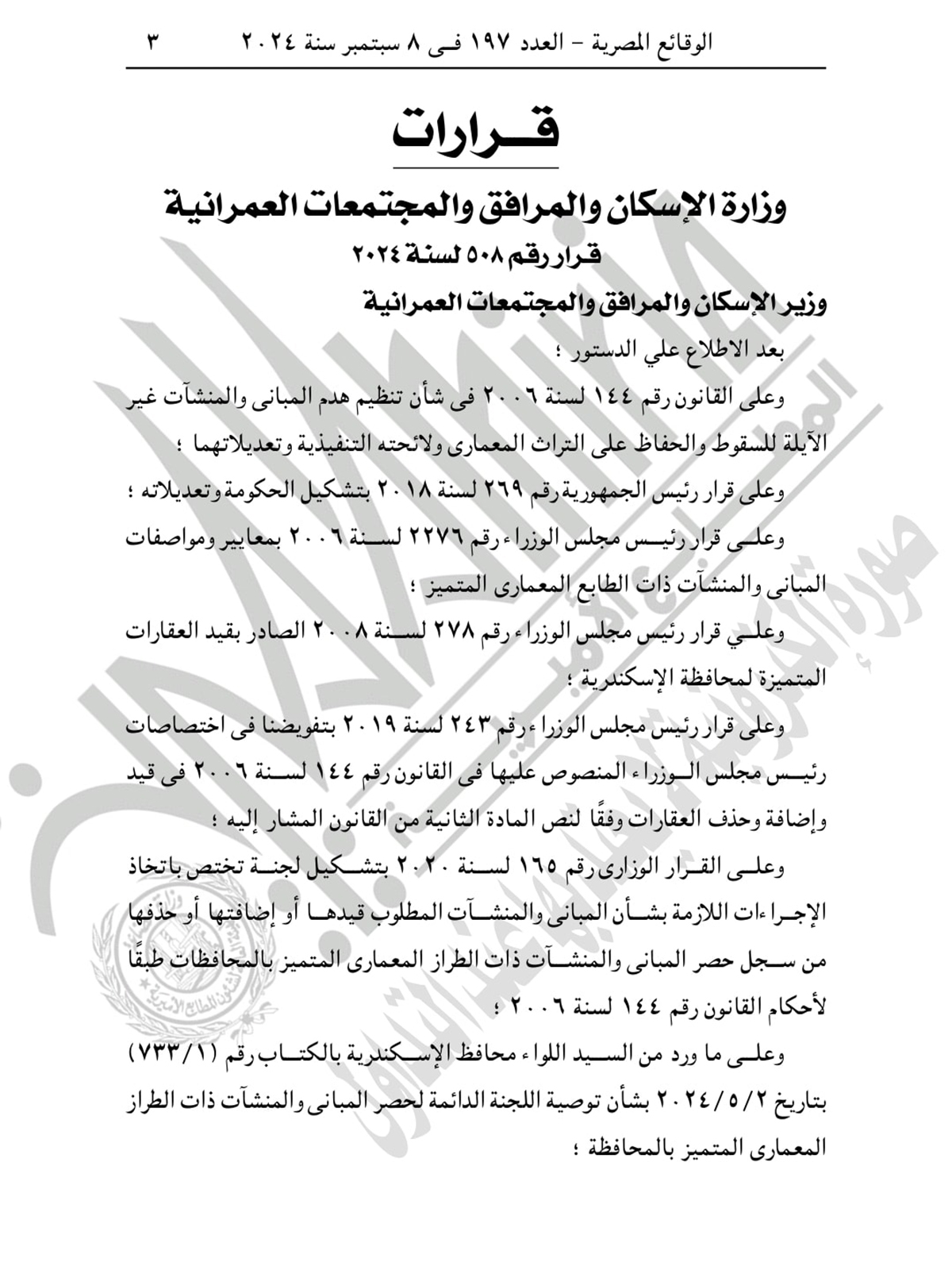 نشرت جريدة «الوقائع المصرية» قرارًا رسميًا بحذف عقارين من قائمة المنشآت ذات الطراز المعماري المتميز في الإسكندرية. العقاران، اللذان يعودان إلى «بدير باشا» في محطة الرمل، يشكلان جزءًا من التراث العمراني للإسكندرية منذ أكثر من قرن، وقد لعبا دورًا بارزًا في تشكيل المشهد الحضري للمدينة. وأحيط المبنيان بعد إصدار القرار بسقالات خشبية، مما أثار تساؤلات عديدة حول مصيرهما.