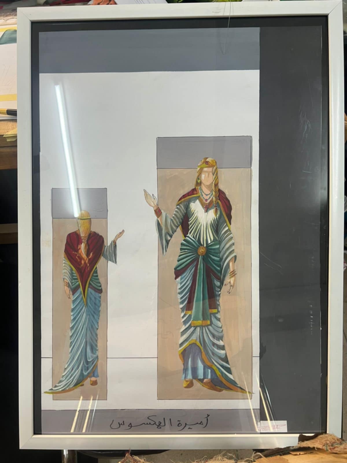 أما لوحته الثانية التي شارك بها في المعرض، فقد عبرت عن “أميرة الهسكوس” من رواية “كفاح طيبة” للأديب العالمي نجيب محفوظ، وجسدها بزي الإغريق وهي تقف مائلة وترتدي مجوهرات كثيرة، مستخدما اللون الفيروزي والأحمر والشفاف.
