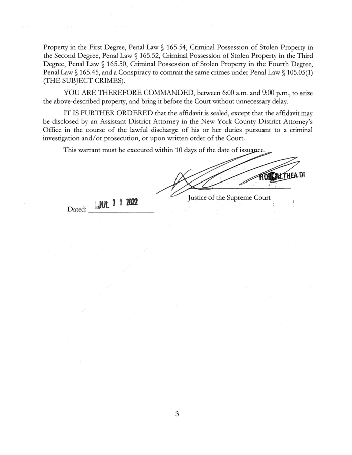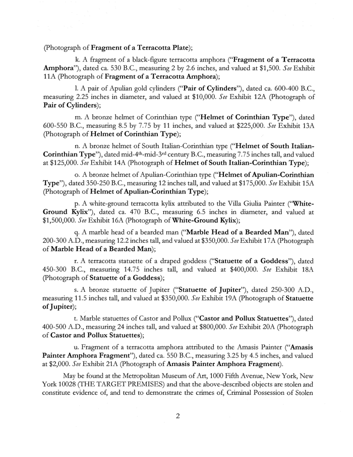 وفي فبراير، حصل المدعي العام في مانهاتن على مذكرتي ضبط لمصادرة قطعتين يُزعم أنهما مسروقتان في صالات عرض مختلفة في المتحف. وهما تمثال ليبي لامرأة محجبة، وتمثال مصري برونزي يجسد شخص راكع ويعتقد الخبراء أنها تصور إما حاكمًا أو كاهنًا.