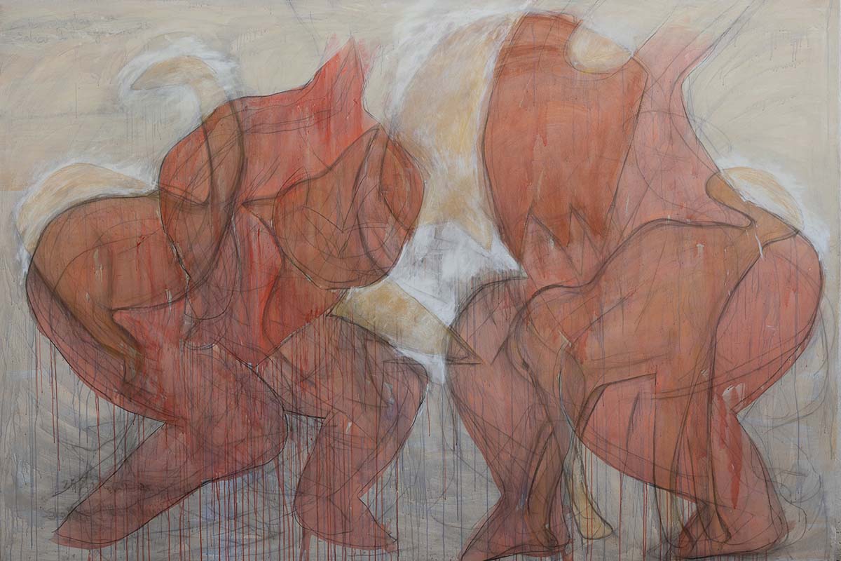فعلي سطح العمل، يتراءى فيه مخلوقات ما بين الضخامة والضعف، والغرائبية، وبين أناس متنوعي الضخامة يستشعرون فراغ اللوحة ويتمركزون بها. محيطهم الذاتي شاسع، يكبر حجمهم ويصغر الفراغ ويتحداهم.