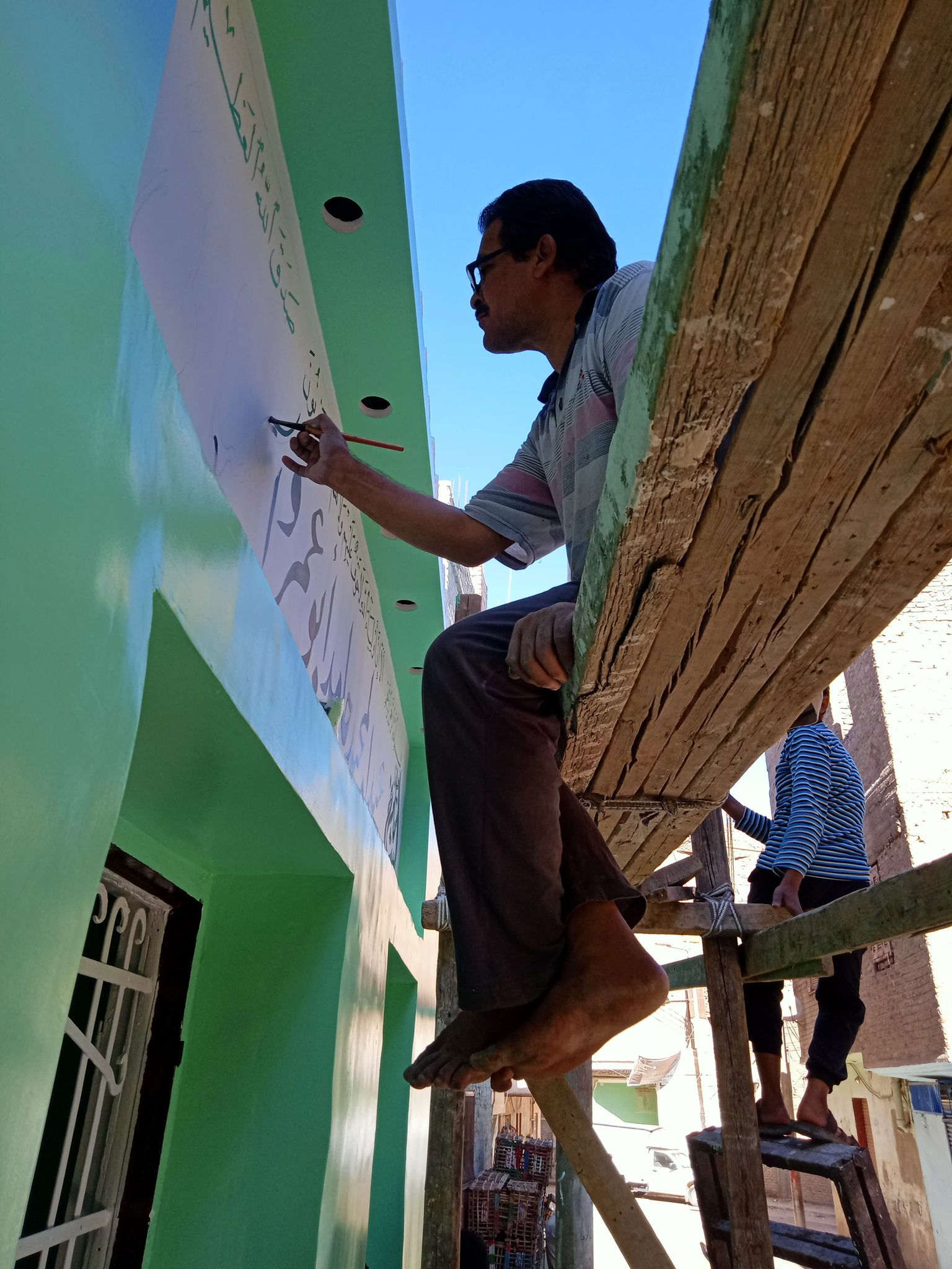 ويوضح، عملت بعد عودتي من القاهرة أخصائيا اجتماعيا بمدرسة عبدالعزيز القوصي للتعليم الأساسي، وكان القائمون عليها يجددونها فقمت بكتابة وتخطيط 20 لوحة بالخط العربي على جدران وحوائط المدرسة بالكامل، وصممت أيضا العديد من اللوحات داخل مكتب مدير المدرسة الثانوية بنين، بعدما انتقلت للعمل بها حتى الآن، وكتبت بعض الخطوط كجداريات على سور المدرسة الداخلي والخارجي.