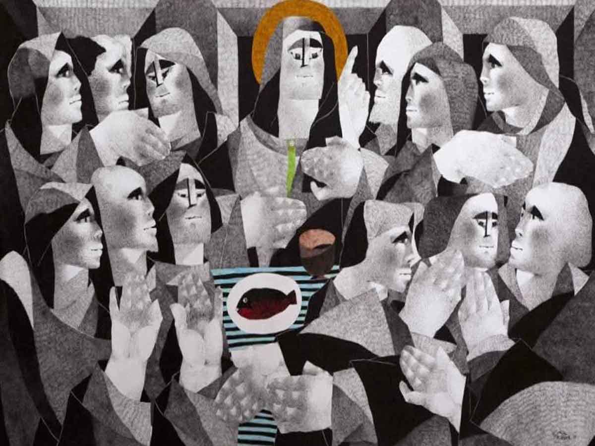 وتستطيع التعامل مع الشخوص الإنسانية وكائنات أخرى، مثل القطط المنتشرة جدا في لوحاتها، كذلك أوراق الشجر. ولوحاتها مروية بالخصوبة والنماء، رغم أنها سيدة شديدة الرقة من خلال معرفتي الشخصية بها، وشديدة القوة في وقت واحد. وهذه القوة ظهرت في تكويناتها، كما قال.