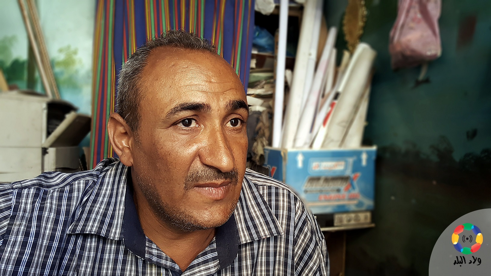 قبل أن نصل إلى ورشته، توجهنا مع الفنان إلى منزل الحاج رمضان، الذي يحتوي على رسومات فنية من أعماله.