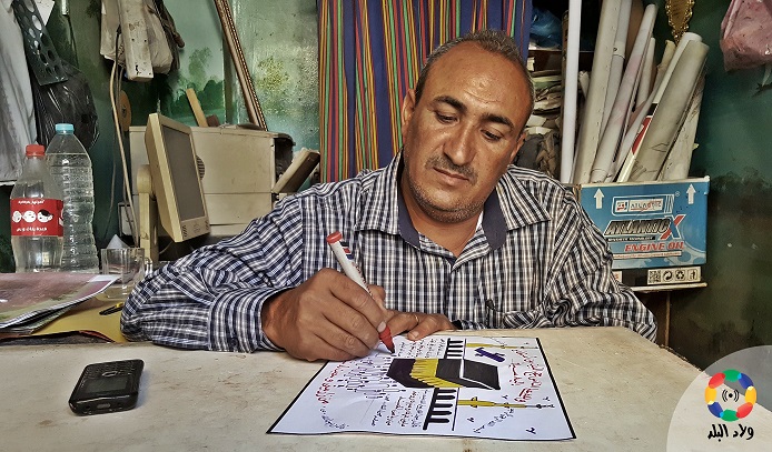 ورشة صغيرة لا تتعدى بضعة أمتار، جدران متهالكة شقوق تغطيها صورًا لأعمال فنان يجلس وحيدًا، وبين شده وجذبه مع رسوماته تنحسر كُمّي قميصه لتظهر “الصليب” مرسومًا على يده.