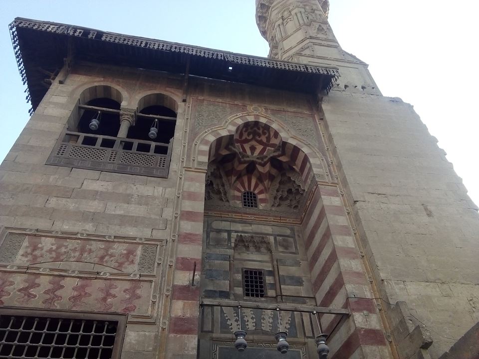 يقول حسين: أول مجموعة للسلطان الأشرف قايتباي هي المئذنة التي تقع على يمين مدخل المدرسة، وتتكون من قاعدة وتنتهى بالدور الأول للمئذنة، لينتهى الدور الأول بشرفة المؤذن وفيها السماعة.