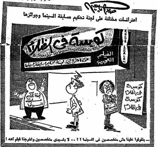 أما الفنان صلاح جاهين فقد قابل هذه القرارات بعدة رسومات كاريكاتورية يؤازر فيها سعاد حسني. فرسم أفيش فيلم بعنوان “كوسة في الظلام” وتحت العنوان مكتوب من إخراج لجنة تحكيم مسابقة السينما والتعليق يقول: “بتقولوا علينا مش متخصصين في السينما؟، لا يا سيدي متخصصين وأخرجنا فيلم أهه”.
