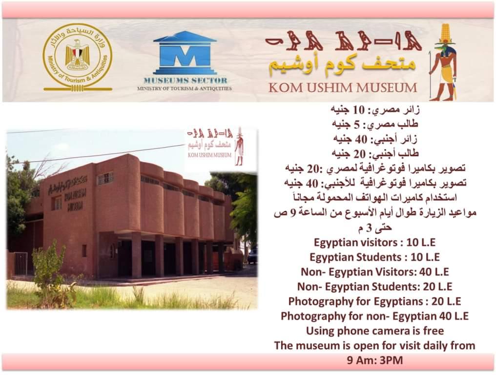 وأشار الشورة، إلى أنه سيتم فتح متحف آثار كوم أوشيم، الذي يوجد بمنطقة مدينة كرانيس الأثرية أمام الزائرين، وسيكون رسوم دخول المتحف بالنسبة للزائرين المصريين 10 جنيهات، وللطالب المصري 5 جنيهات، وتبلغ قيمة تذكرة الدخول للزائر الأجنبي 40 جنيهًا، وللطالب الأجنبي 20 جنيهًا، وتبلغ رسوم التصوير بكاميرا فوتوغرافية للمصريين 20 جنيها وللأجانب 40 جنيها، بينما لا توجد رسوم على التصوير بكاميرا الموبايل، وتبدأ زيارة المتحف من التاسعة صباحًا وحتى الثالثة مساءً.