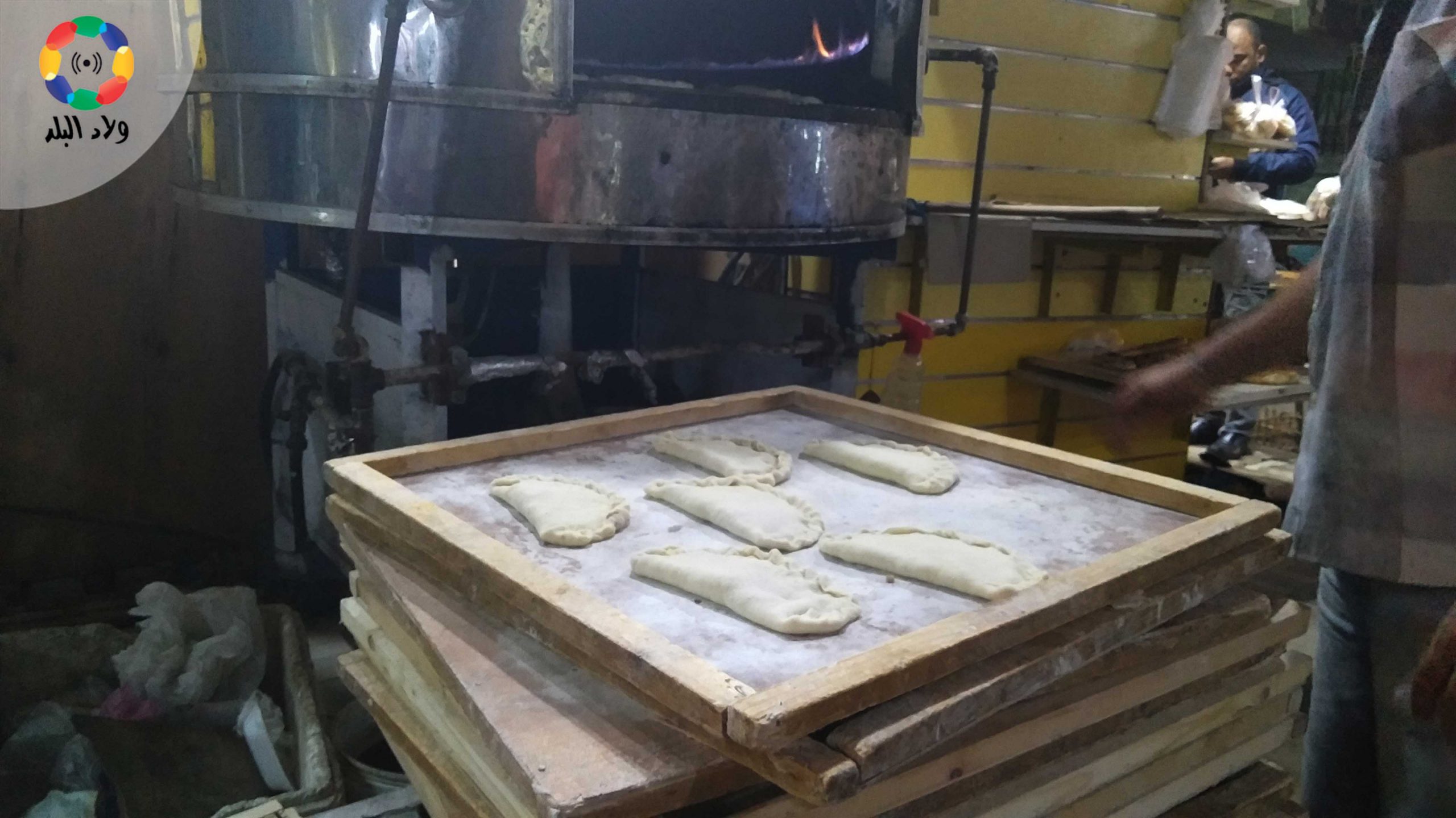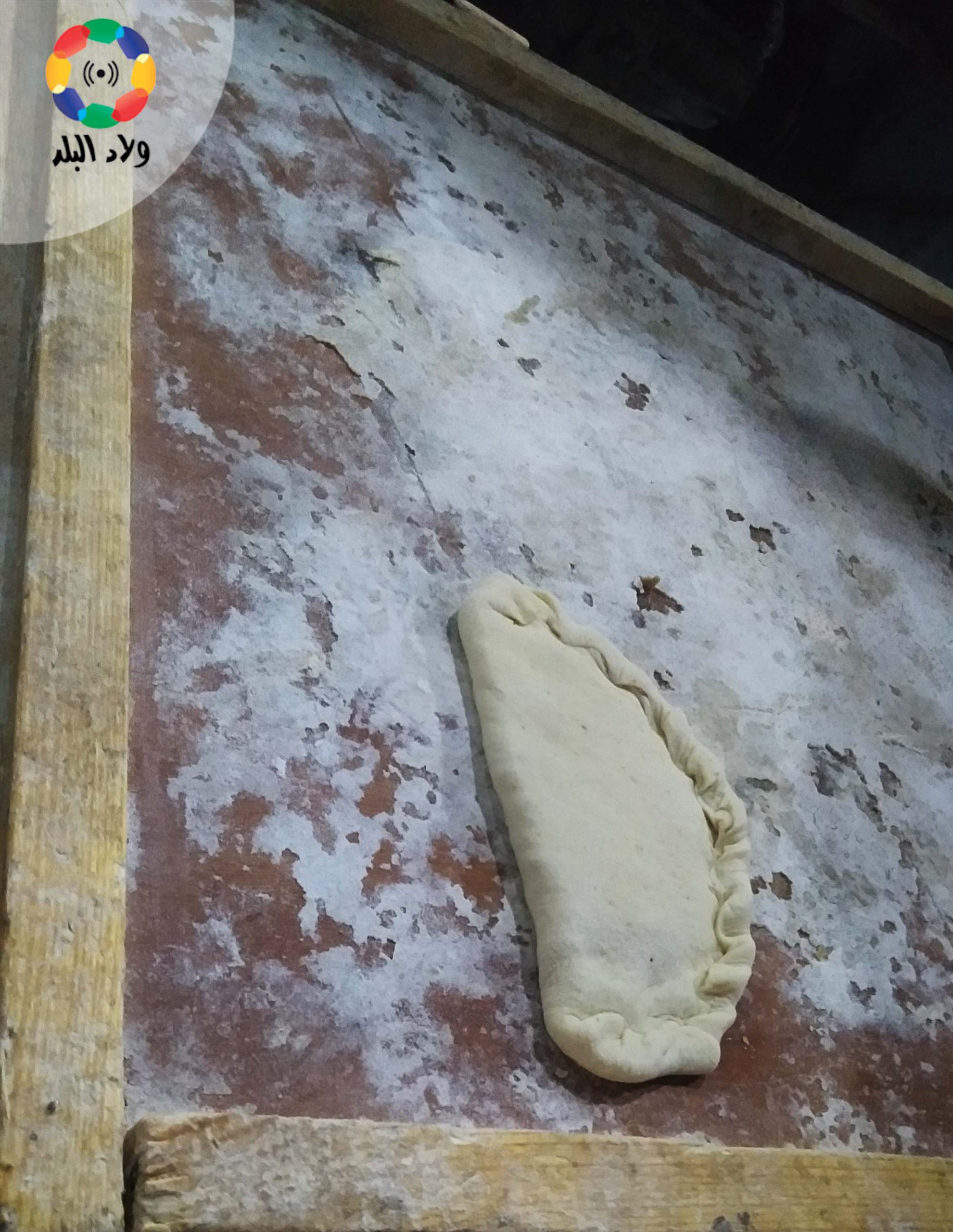 وبجوار أحد المخابز تقف ربة منزل وهي تضع اللحم المفروم النيء بخلطته، التي أعدتها في منزلها في العجينة التي خبزها الفران، ثم يضعها داخل الفرن.