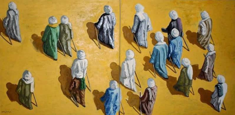 في عدد كبير من لوحاته تتلاشى الملامح التي تميز الإنسان. لا نجد أمامنا أكثر من جلباب منتصبٍ، وعمامة كبيرة بيضاء، ووجهٍ بلا تفاصيل مميزة. لون الوجه أهم علاماته، لونه في لوحات كثيرة يشبه لون العصا، وكأن اللون يشير إلى شيء واحد، العصا هي الوجه، والوجهُ هو العصا.