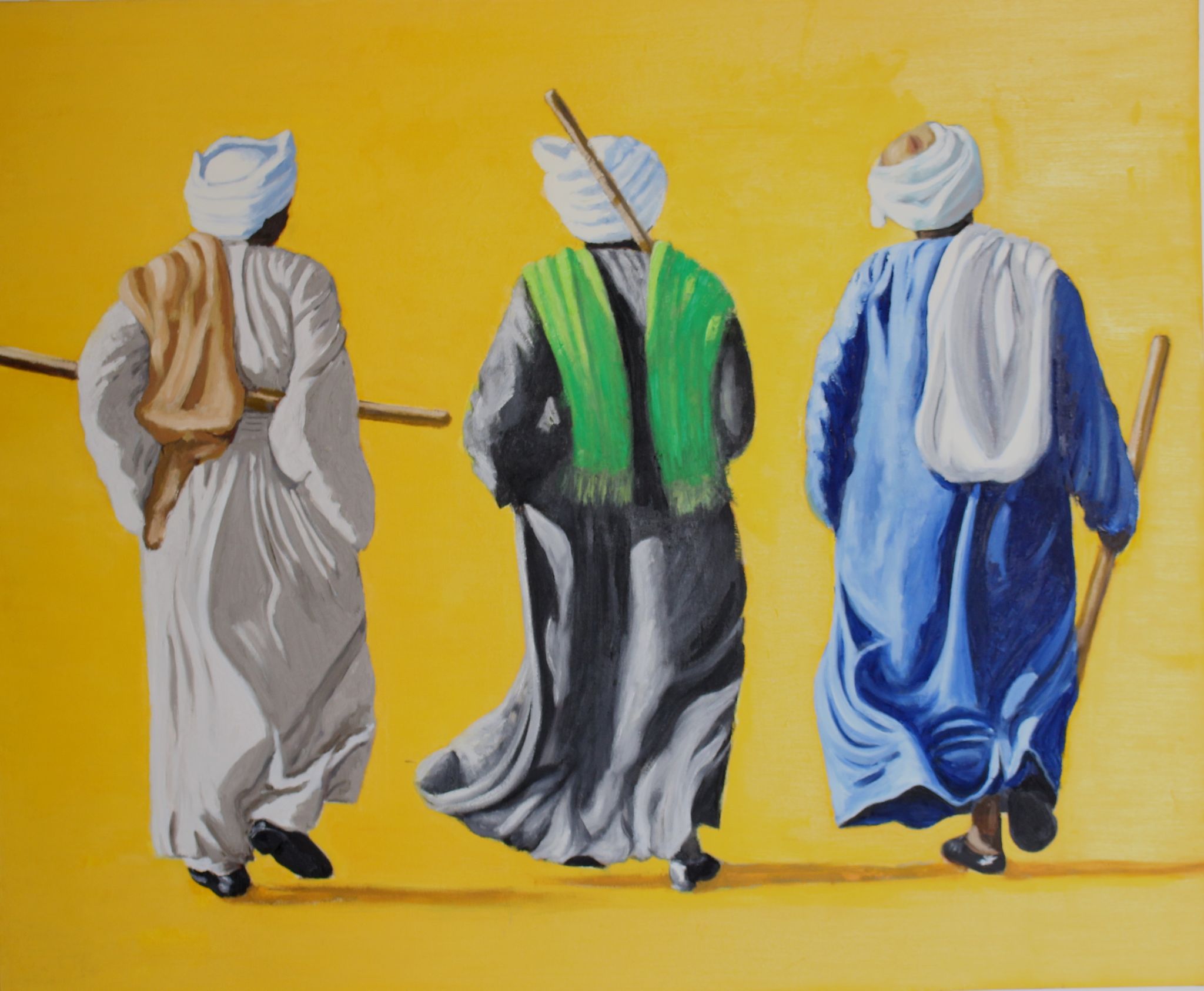 العصا تتقدم والمريخي يفسح لها الطريق. يضحي بخلفية اللوحة كي لا تشغلنا وتأخذنا من العصا. يترك الخلفية صفراء في مشاهد كثيرة ربما لتوحي بالمشاوير التي لا تنتهي أبدا، أو بالجدب وترابِ المقابر التي تعيش بعيدا عن النيل.