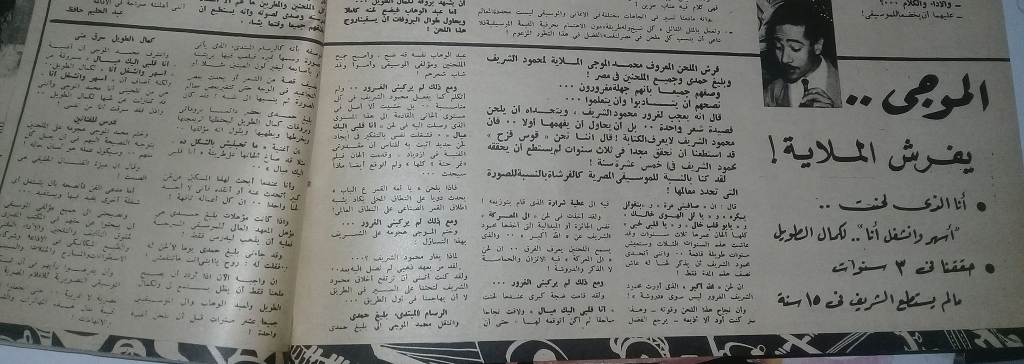 أما تصريحات الموجي فى آخر ساعة (18 ديسمبر1957): وانتقل الموجي إلى بليغ حمدي فوصفه بأنه كالرسام المبتدئ الذي يأتي بصورة رسمها غيره فيلعب فيها بريشته أو بأصابعه ليغير لون العينين مثلا أو يضيف قصة من الشعر حتى تتغير بعض معالم الصورة ثم ينسبها إلى نفسه، فقد كان بليغ حمدي يحضر دائما بروفاتي وبروفات كمال الطويل ليحفظها ثم يعجنها ويخرطها ويطهيها ويقول أنه مؤلفها.