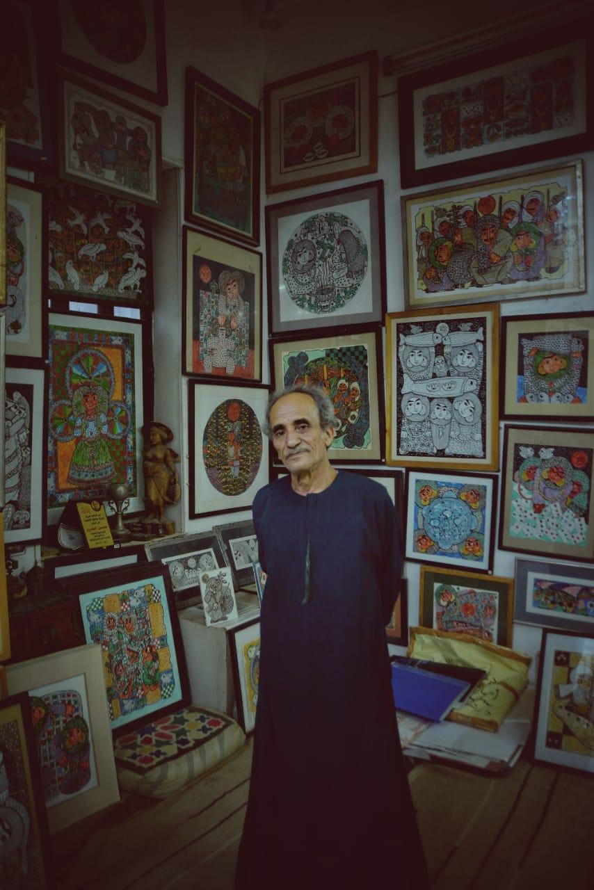 يتحدث الفنان عن لوحاته التي استقرت فى أشهر متاحف العالم.. يقول: كنت أقوم برسم جدران منازل الحجيج في القرية لمدة تخطت الـ25 عاما، حتى جاءت الصدفة بقدوم المستشرقة الألمانية “أورزولا شيورنج” في زيارة إلي قريتي مع وفد ألماني، في زيارة لمقابر بني حسن الأثرية، وعندما شاهدت لوحاتي أعجبت بها كثيرا، فكان لها دورا مميزا في اكتشافي عام 1985. وبالفعل أقامت لي معرضي الأول في ألمانيا بمدينة شتوتجارت، ثم في ميونيخ عام 1989. وفي عام 1991 أقمت معرضًا بفرنسا، وفي متحف اللوفر ثم في سويسرا، وفى عام 1994 بقصر “برج برنبخ” بألمانيا، وبعدها حصلت علي مفتاح مدينة “نوربيرج” الألمانية عن مجموعة أعمالي الفنية، وتم تأليف كتاب عني بعنوان “حسن الشرق والريف المصري” وتُرجم إلى العديد من اللغات، كما عرضت لوحتان من أعمالي بالصالة الحديثة بمتحف اللوفر بفرنسا، وحصلت على المركز التاسع عالميا في بينالي في أمريكا.