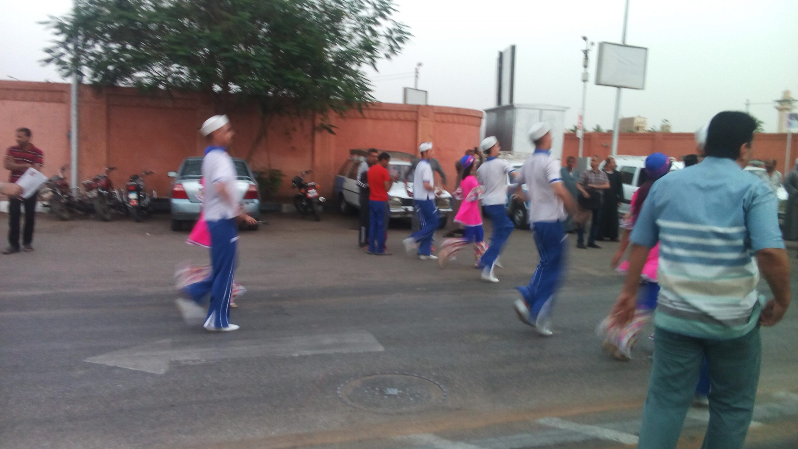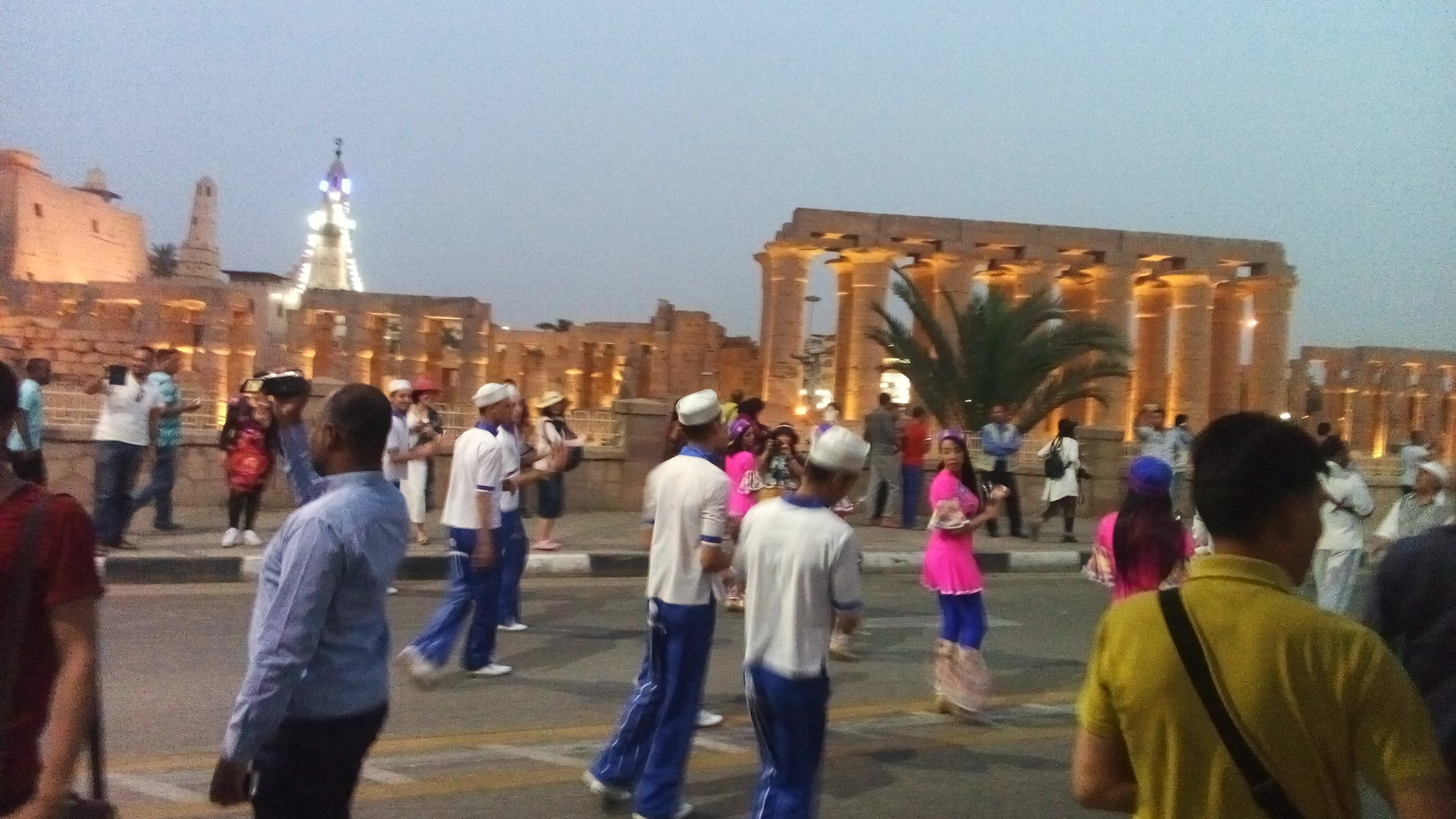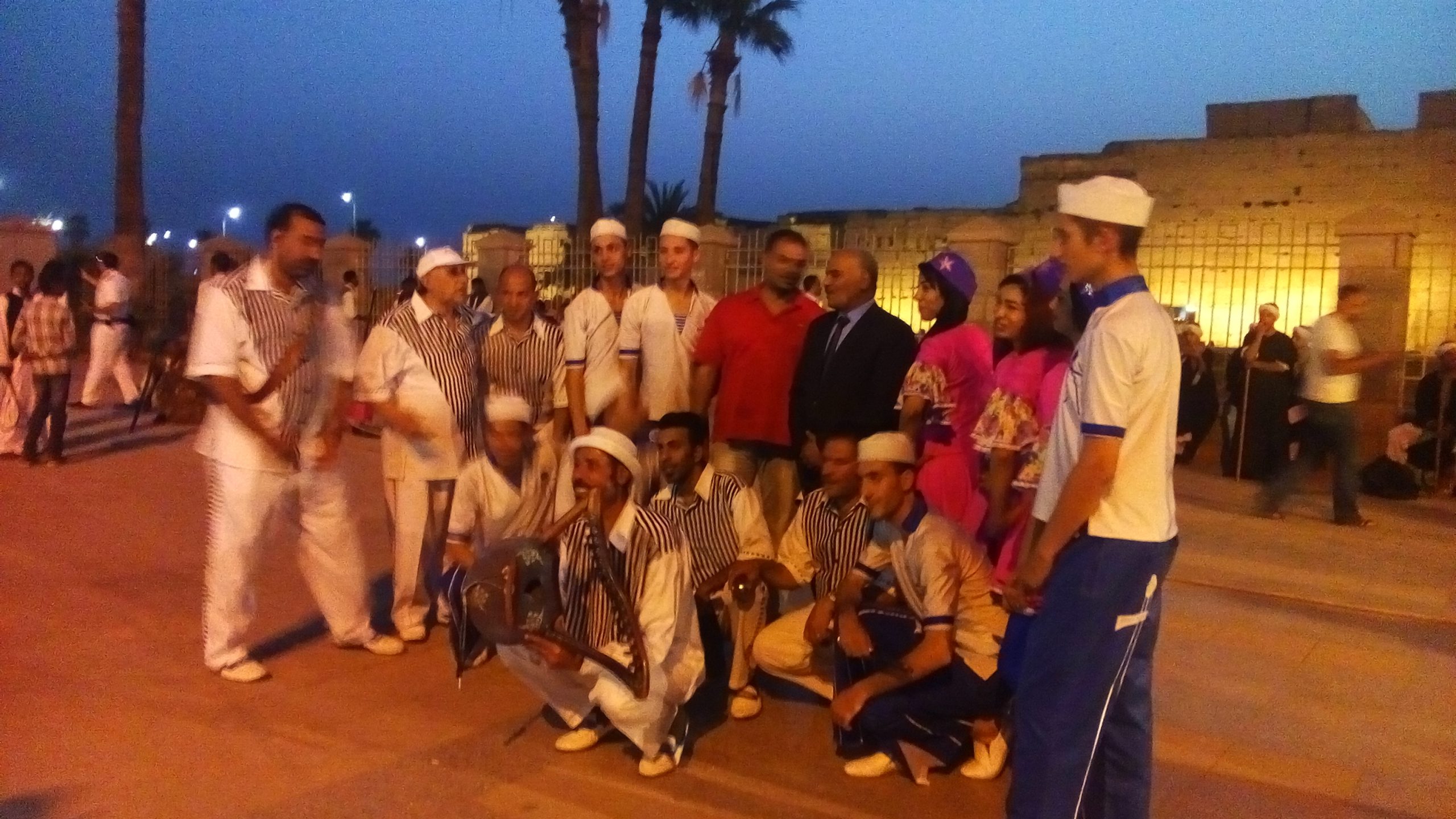 في طابور امتد لمسافة تجاوزت الخمسين مترًا، فرق دولية وأخرى مصرية جميعها تتحرك في تناسق وتناغم، التنورة تتقدم الطابور، ثم فرقة بورسعيد تتراقص على أنغام ” البمبوطية” في زيها، ولحن السمسمية البورسعيدية، تقدم حركاتها الاستعراضية في خفة ورشاقة أذهلت الحضور، تليها فرقة الصين، ثم نيجيرا، وروسيا وأندونيسيا وموريشيوس، ثم فرقة توشكى تعزف فلكلورها على أنغام الدفوف، ثم فرقة الأقصر للفنون الشعبية والأقصر للموسيقى والغناء الشعبى والأقصر بلدنا.