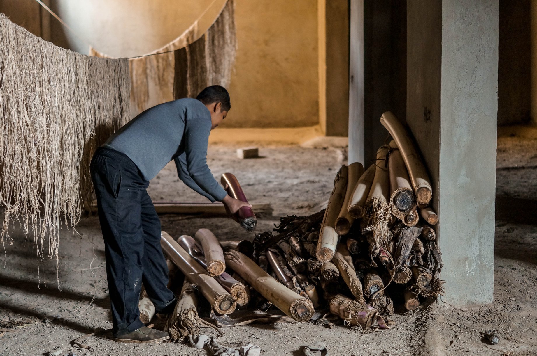 ويوضح عبد الله محمود، عامل، دوره في المشروع، قائلًا: “بناخد العربية ونجيب مخلفات أشجار الموز من المزارع، ونقطعها ونستخراج الألياف منها”، لافتًا إلى أنه عند استخراج الألياف يجري اختيار الطبقة الثالثة منها، ثم بعد ذلك يدخلها داخل المكينة ويخرجها على هيئة خيوط متوسطة السمك، ثم غسلها وتنظيفها بالمياه، ثم تأتي مرحلة التجفيف بنشرها في الهواء حتى تجف تماما.