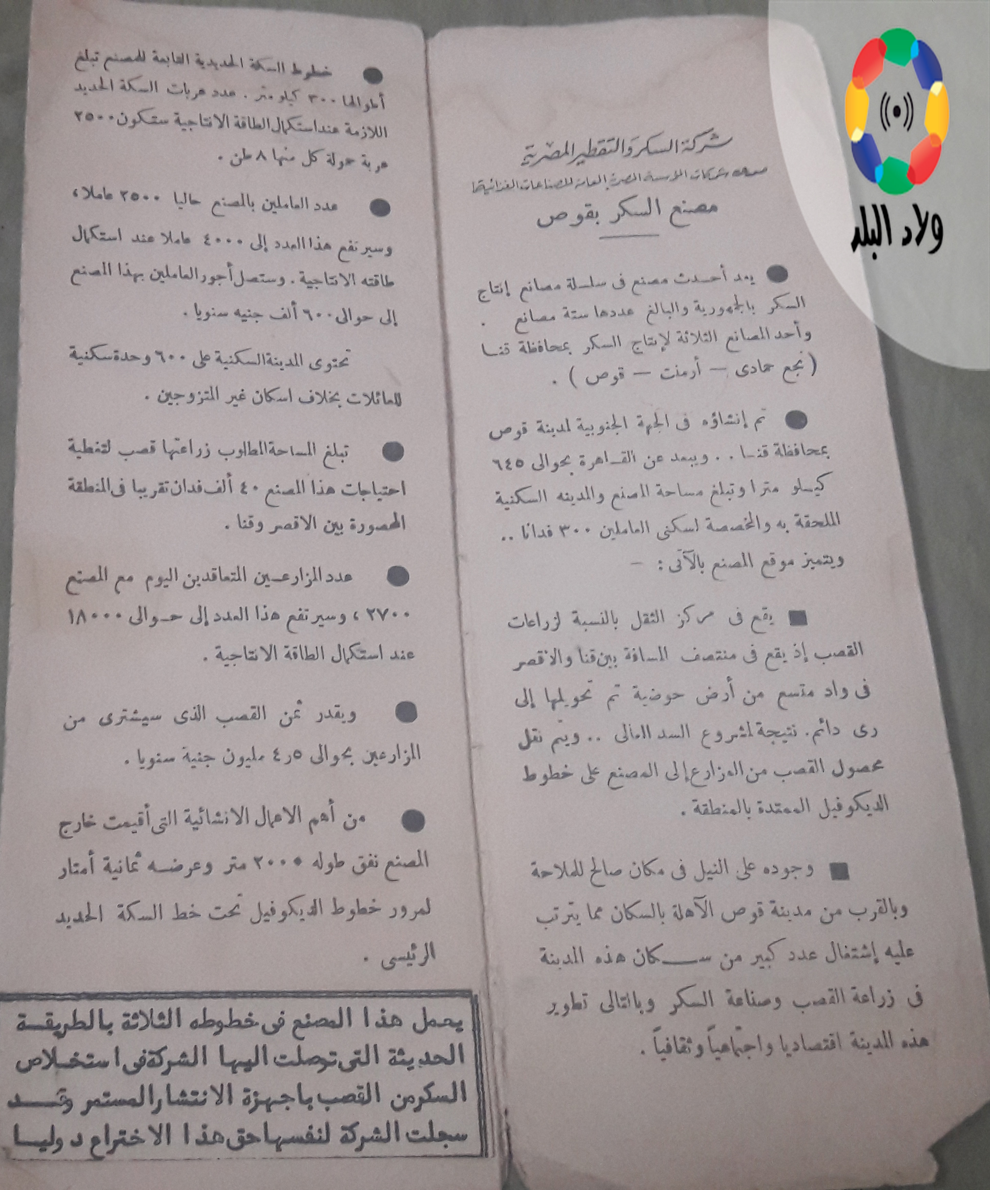 في مارس 1968، وبعد 4 أعوام من إنشائه، نشر مصنع سكر قوص، التابع لشركة السكر والتقطير المصرية، إحدى شركات المؤسسة المصرية العامة للصناعات الغذائية، مطويّة تعرف مصنع السكر بقوص في 14 فقرة، بمناسبة بدء إنتاجه. وأشارت الفقرة الأولى من الوثيقة- التي نعيد نشرها بمناسبة عيد العمال- إلى أنه أحدث مصنع في سلسلة مصانع إنتاج السكر على مستوى الجمهورية، وكان وقتها 6 مصانع، نصفها في الصعيد وهي مصانع (نجع حمادي وأرمنت وقوص).