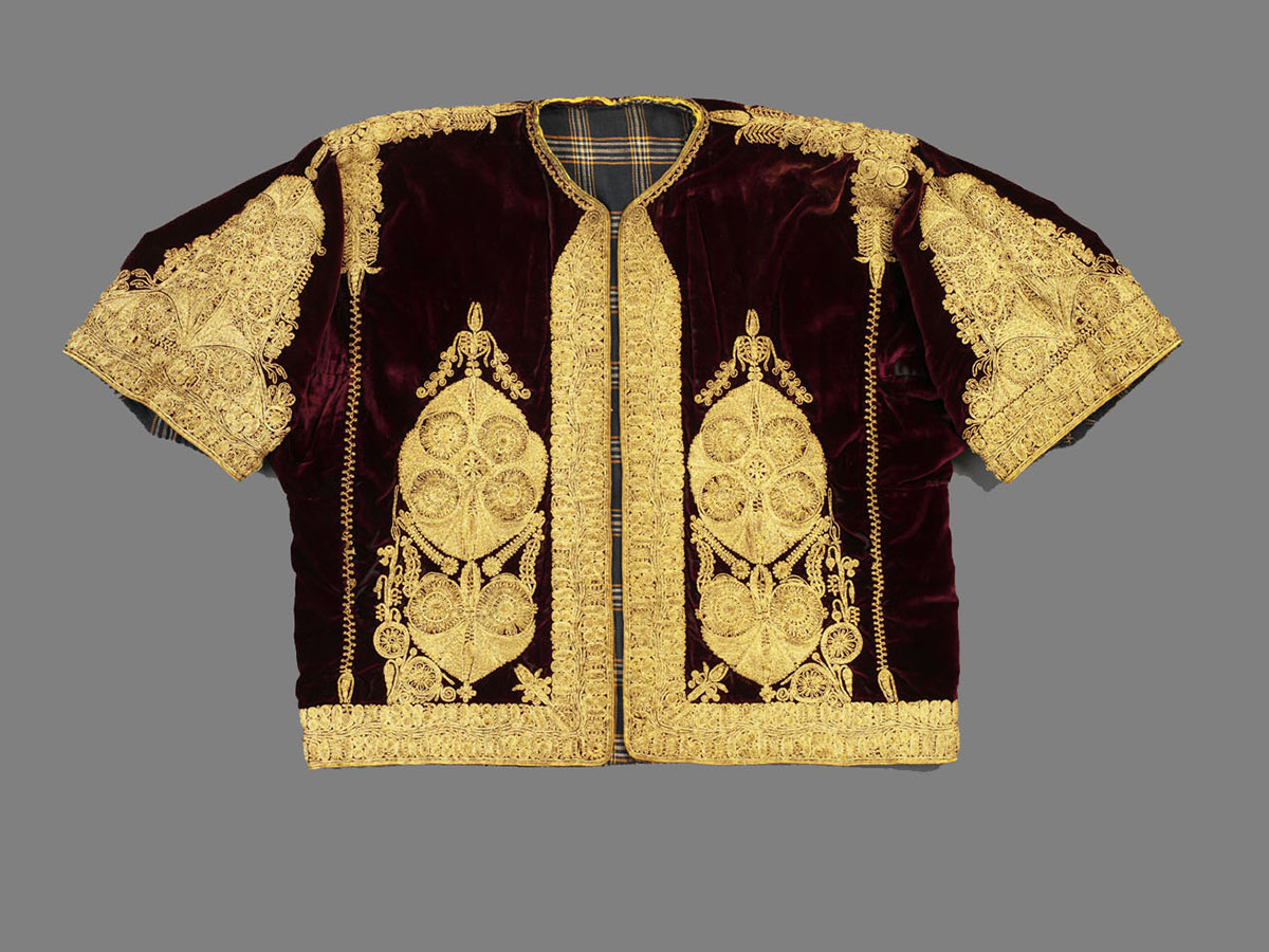وقطع أخرى قد تشاهدها للمرة الأولى، لقبعة مخروطية الشكل مرصعة بالعملات العثمانية والخرز المرجاني والتطريز الحريري. وكلها مرتبطة بالمجوهرات الفضية الرقيقة التي كان من المفترض أن تتدلى فوق فستانها.